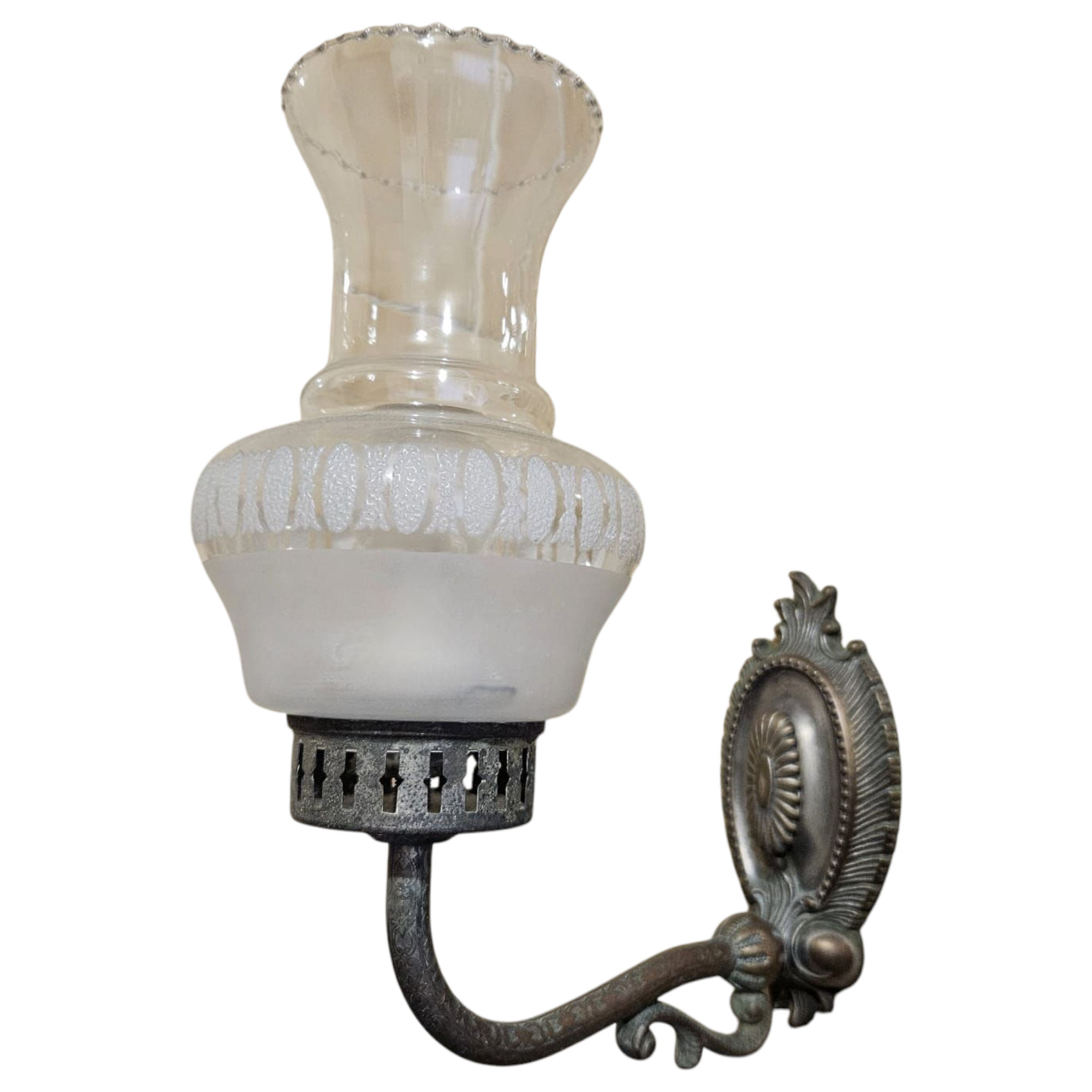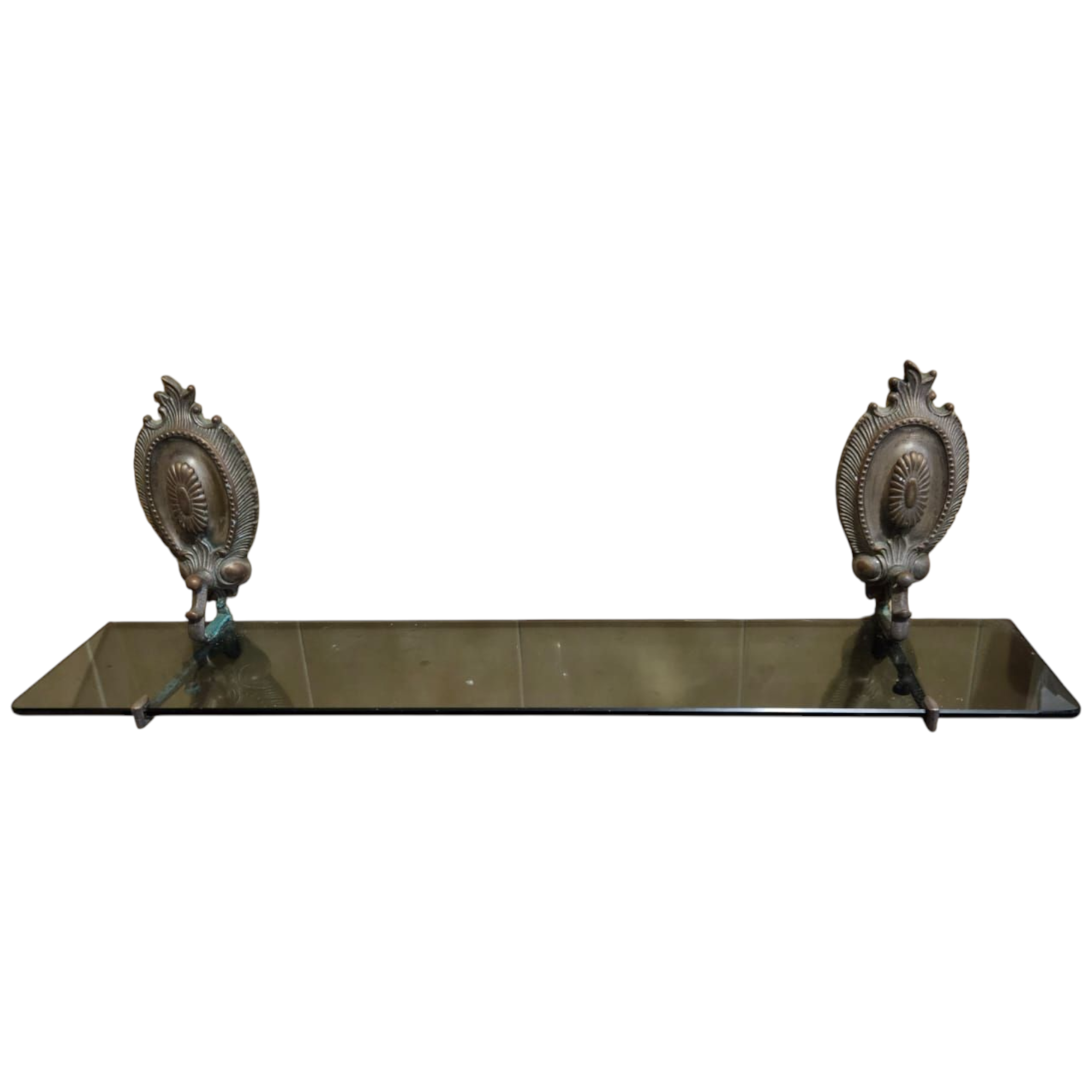 Accesorios de baño metálicos vintage. Consta de una estantería de cristal, una jabonera, un toallero y dos tulipas de pared.