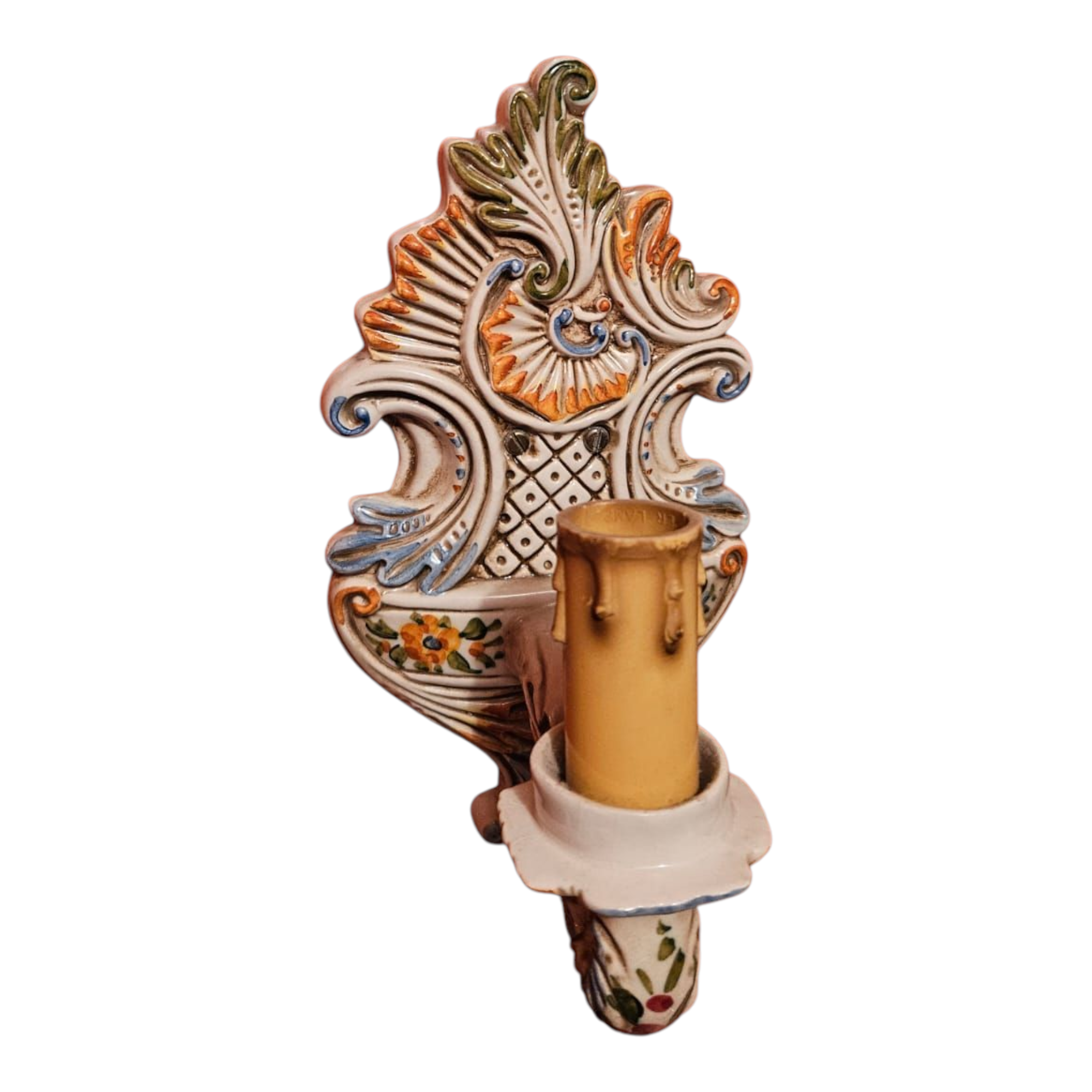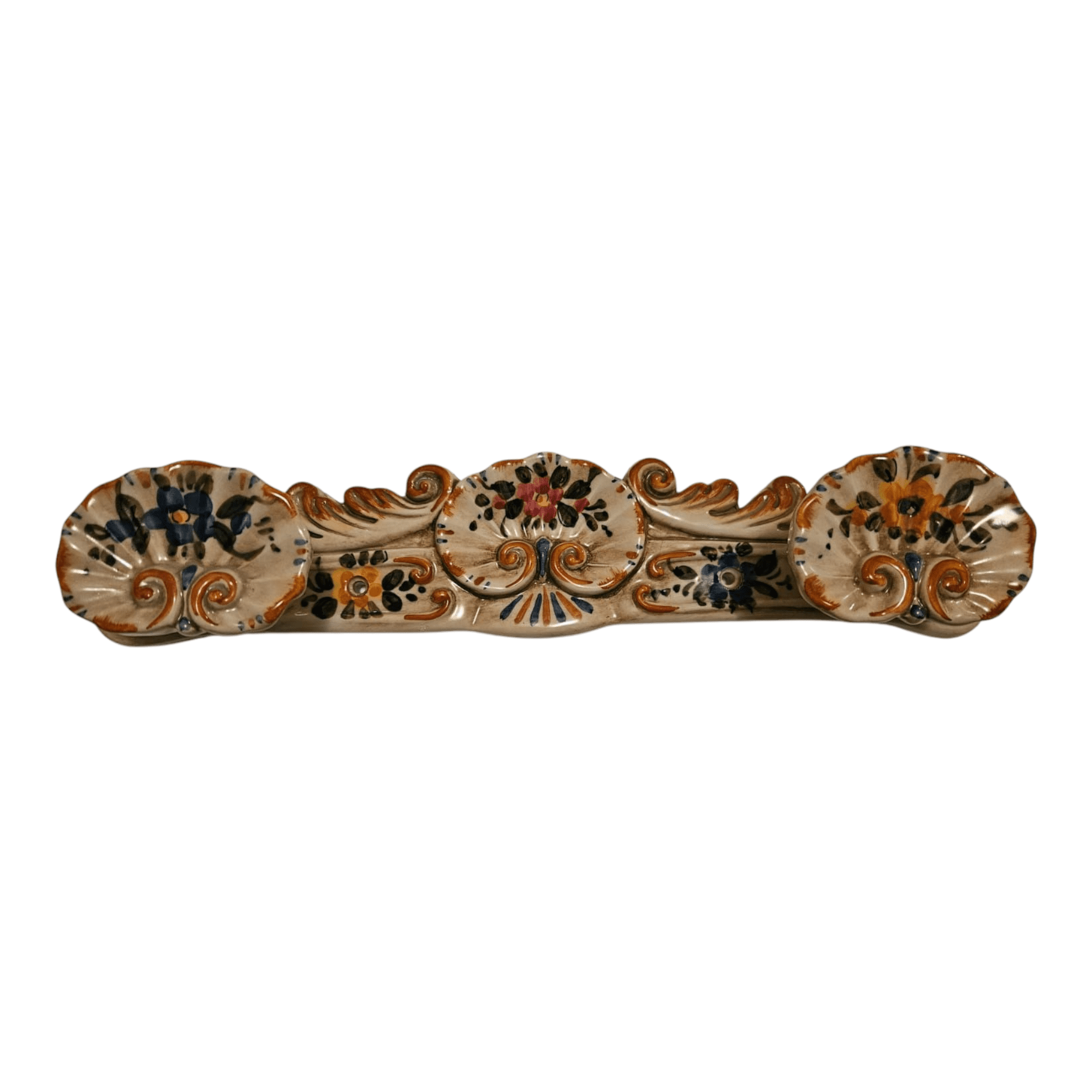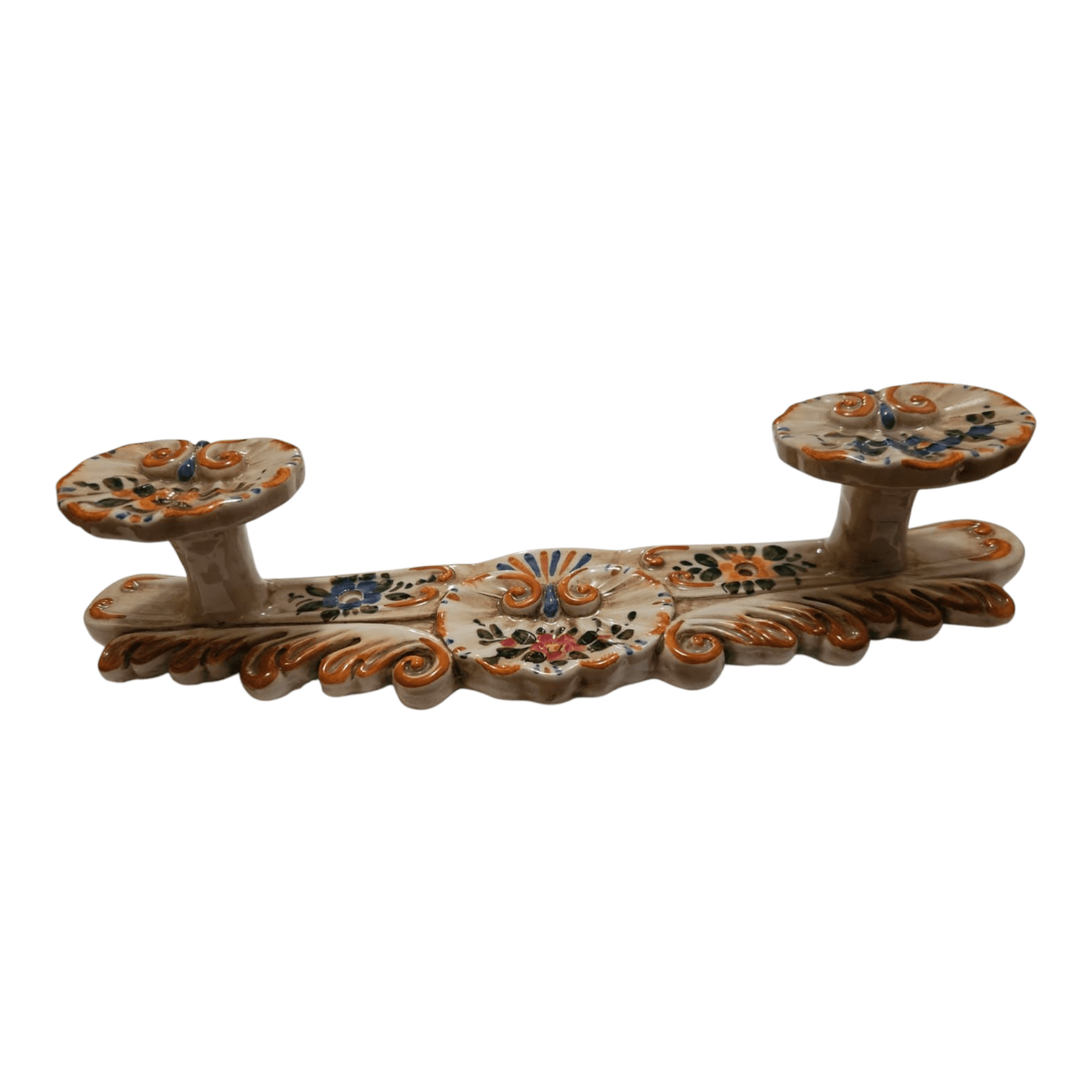 Conjunto de accesorios de cerámica de baño vintage compuesto de dos lámparas tipo candelabro de medidas 23×13 cm y un colgador toallero de medidas 34×7 cm.