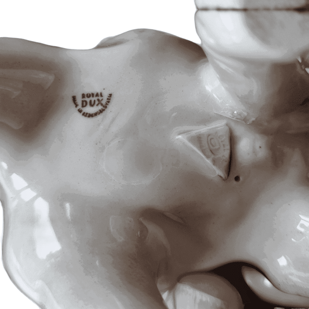 Realizado en cerámica bohemia y grabado con la marca Royal Dux Checoslovaquia. Con logotipo de fábrica rosa en forma de triangulo. Esta en perfectas condiciones, sin grietas ni roturas, lo que la convierte en una pieza muy buscada por los coleccionistas.