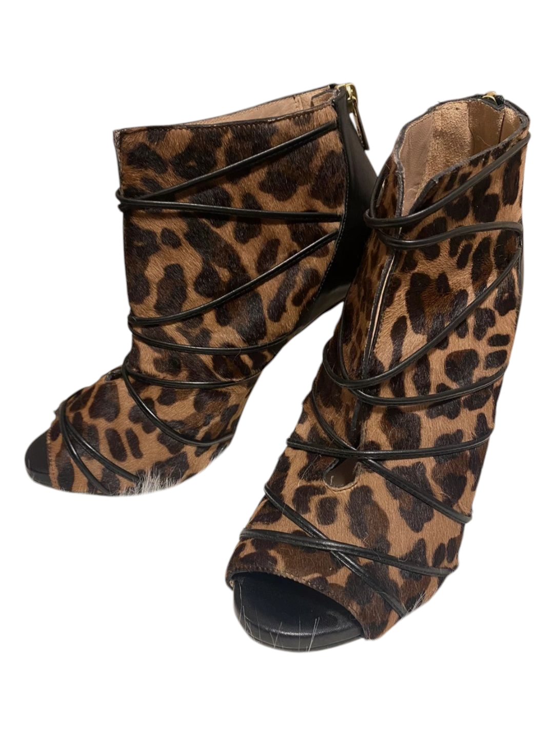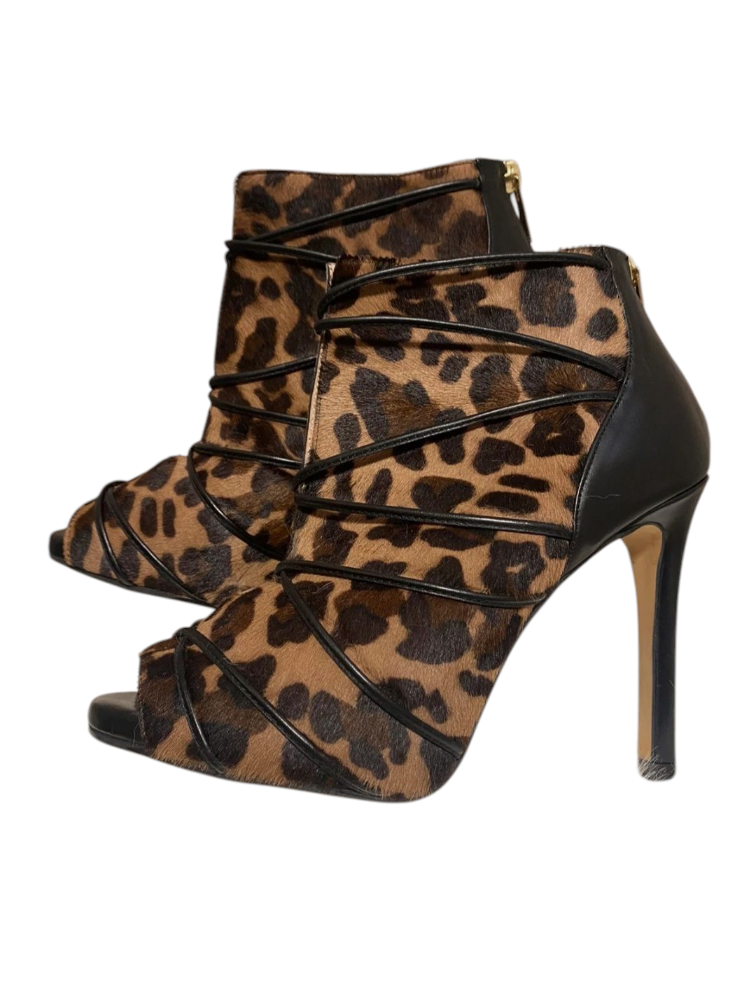 Estiloso botín de piel “animal print” con punta abierta. Talón de piel negra con cremallera que permite un mejor ajuste al pie. Ideal para falda o pantalón. Talla 37.
