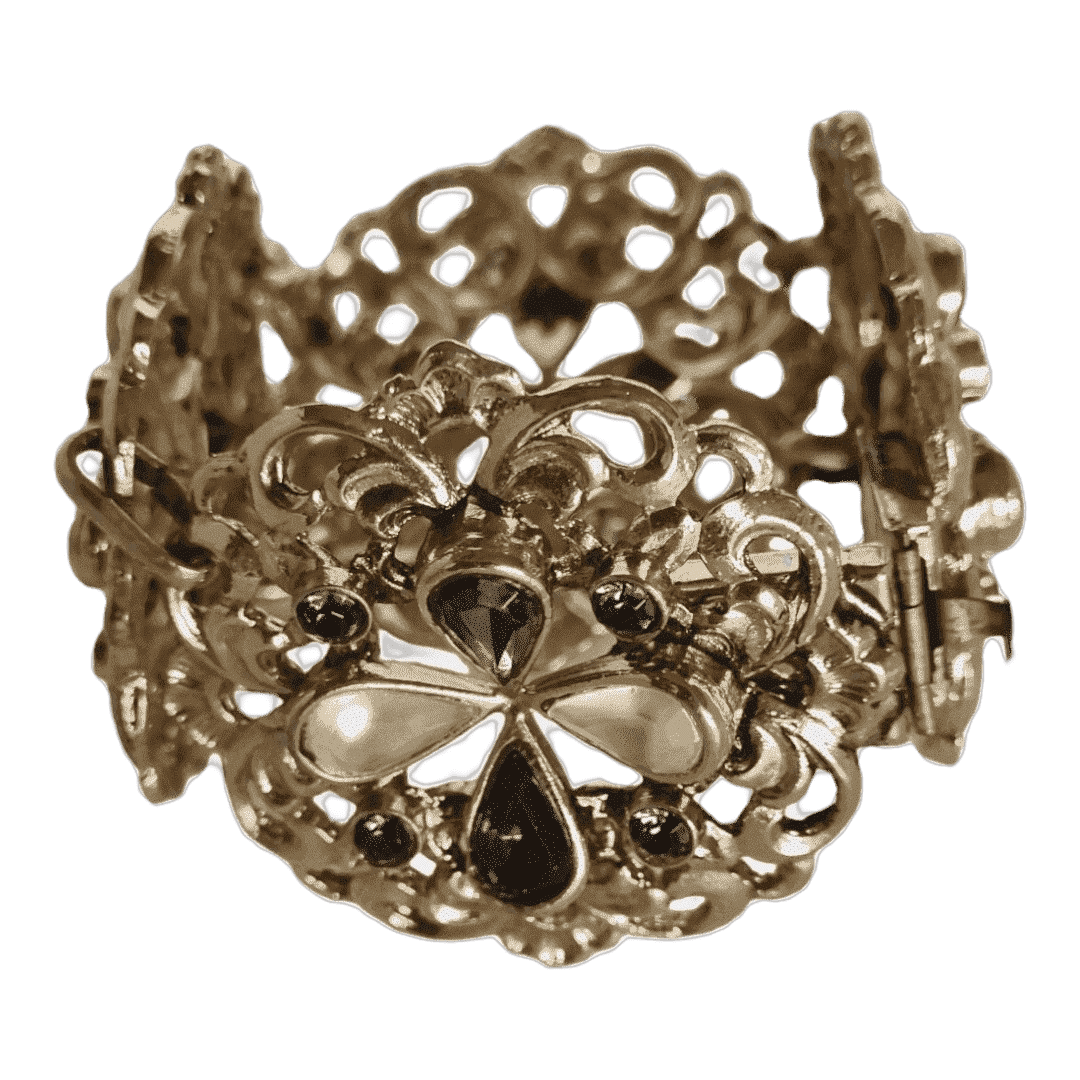 Brazalete de flores vintage en dorado. Incrustaciones de piedras en forma de flor en azul y blanco. Cierre de clip.