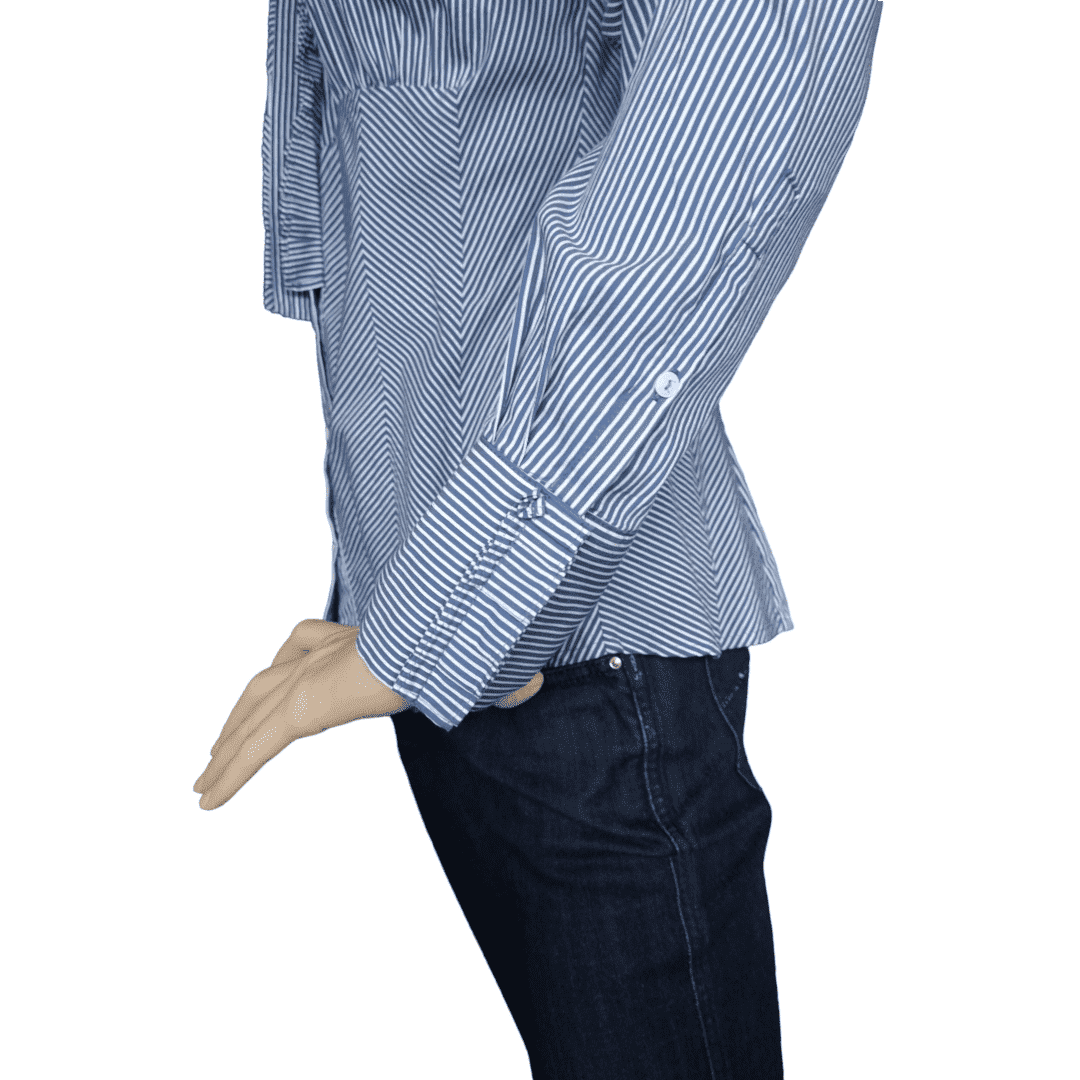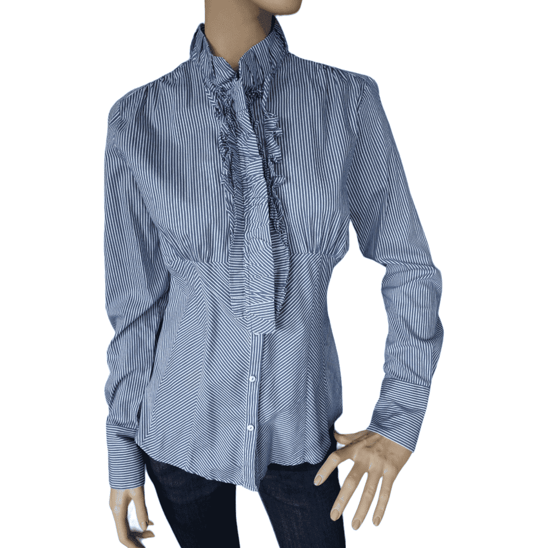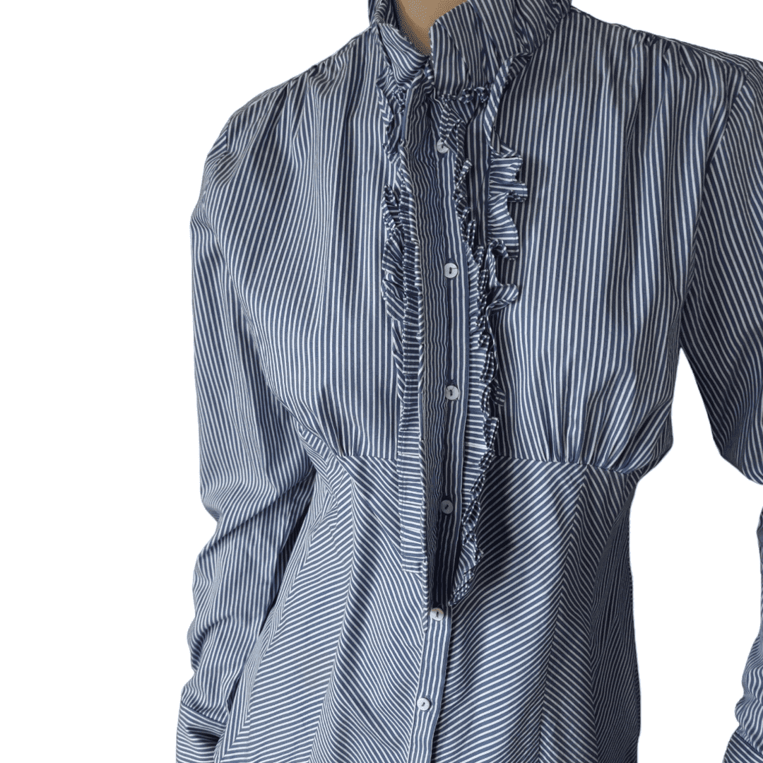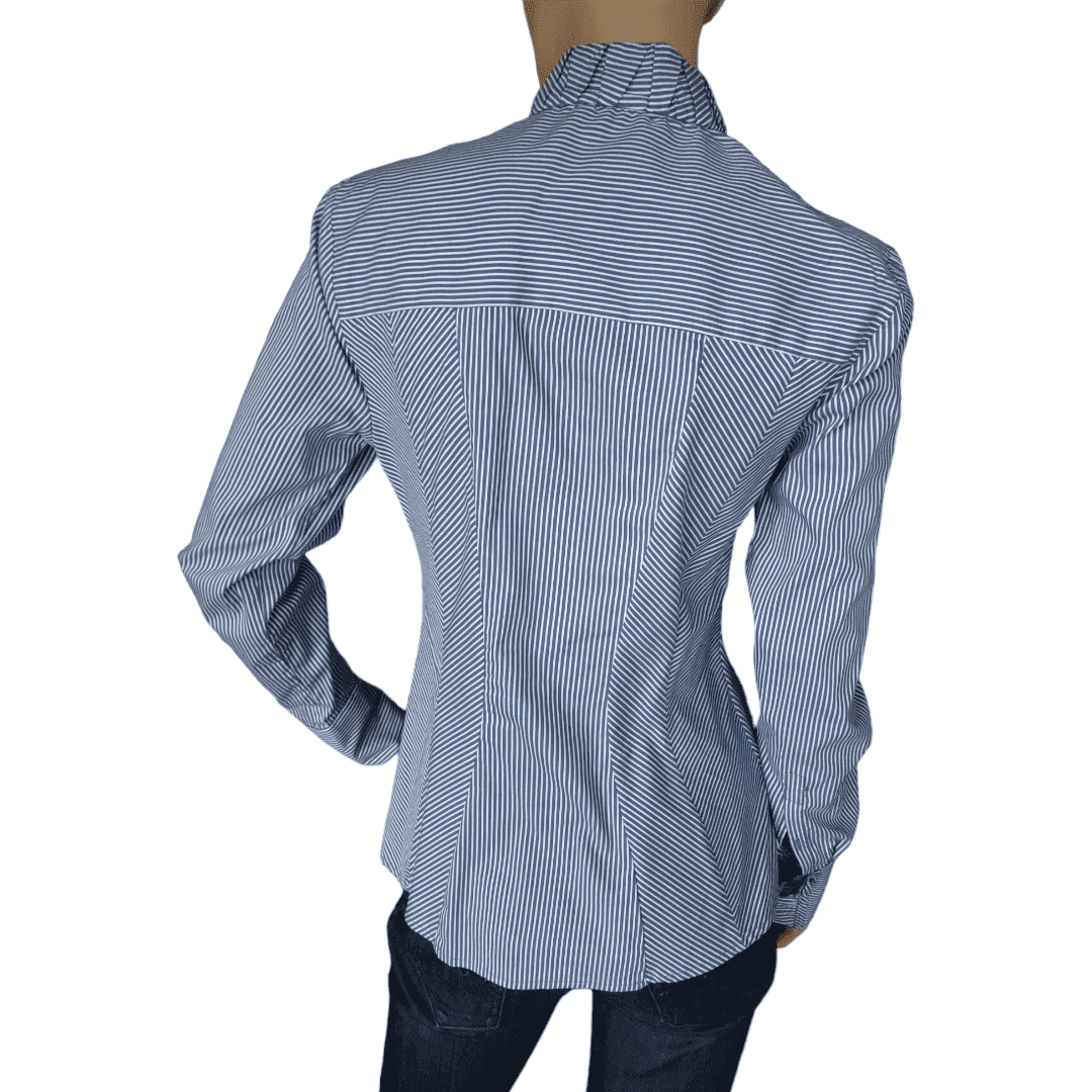 Camisa de rayas verticales de manga larga. Puño en la manga con cierre de botones tapados por un volante. Cuello subido y cierre delantero con botones tapados con un volante. Corte en el canesú y cintura entallada.
