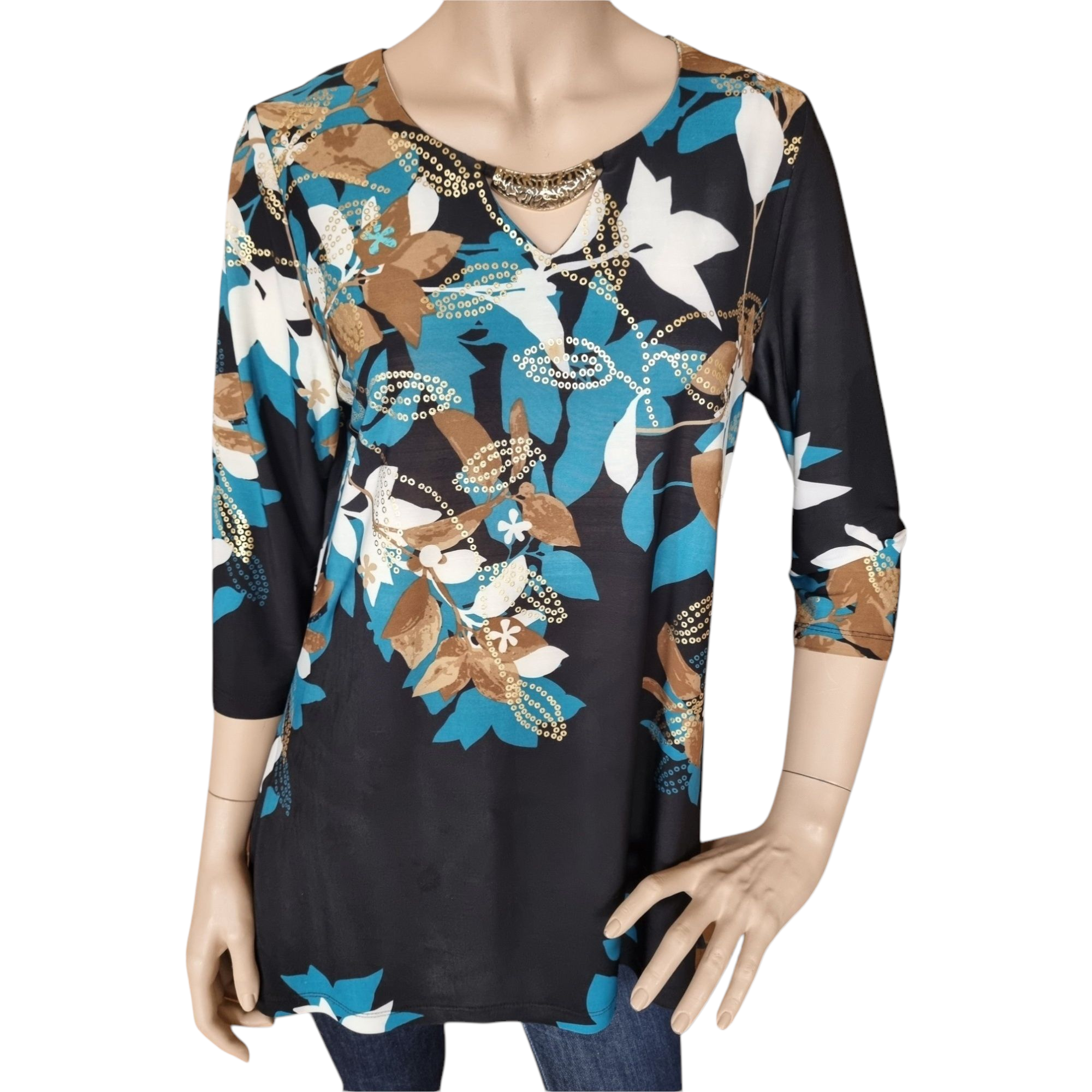 Camiseta de mujer en Punto de poliéster con manga 3/4. Estampado floreado sobre fondo negro y detalles en dorado. Cuello redondo con aplique metálico en dorado.
