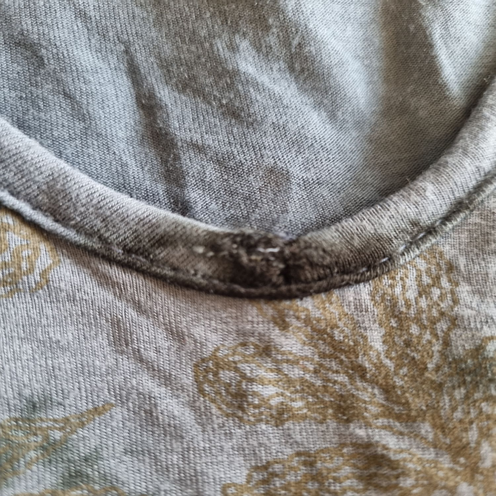 Camiseta de mujer de Guitare, en color azul y con bordados multicolor. Manga larga y escote de pico con un pequeño desperfecto según se aprecia en la foto 4.