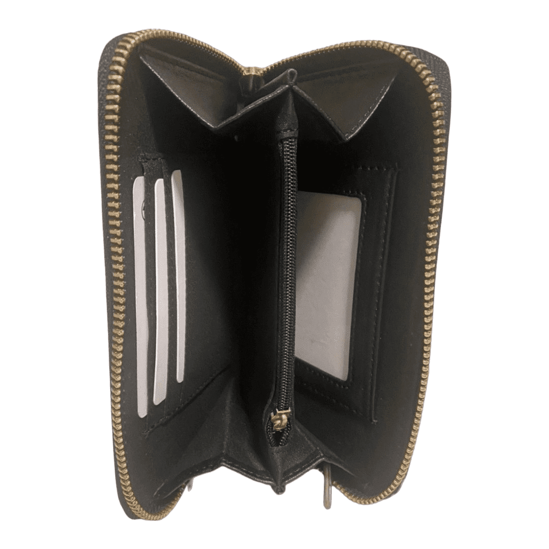 Cartera monedero símil piel en color azul. Cierre central de cremallera. Dos amplios compartimentos separados y tarjetero.