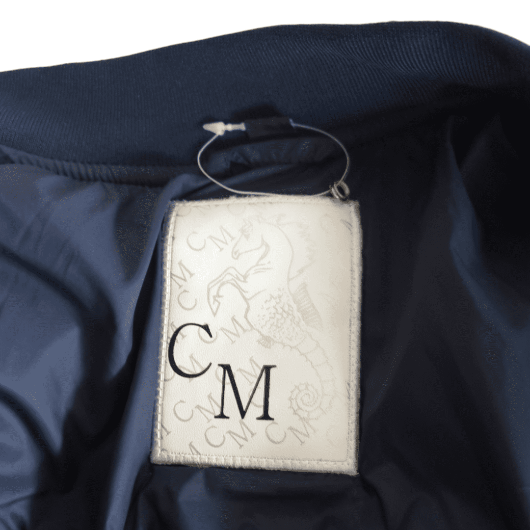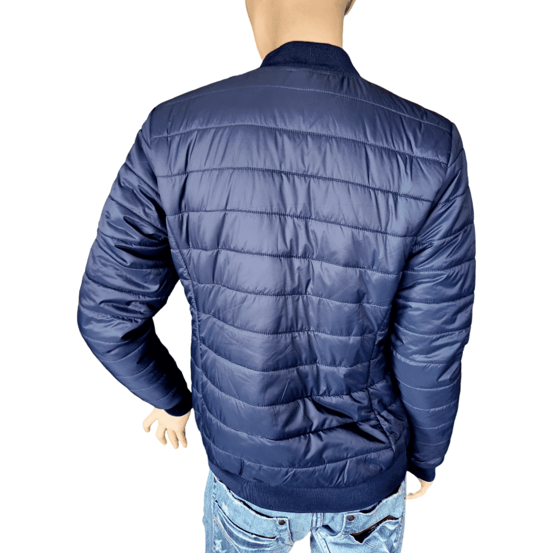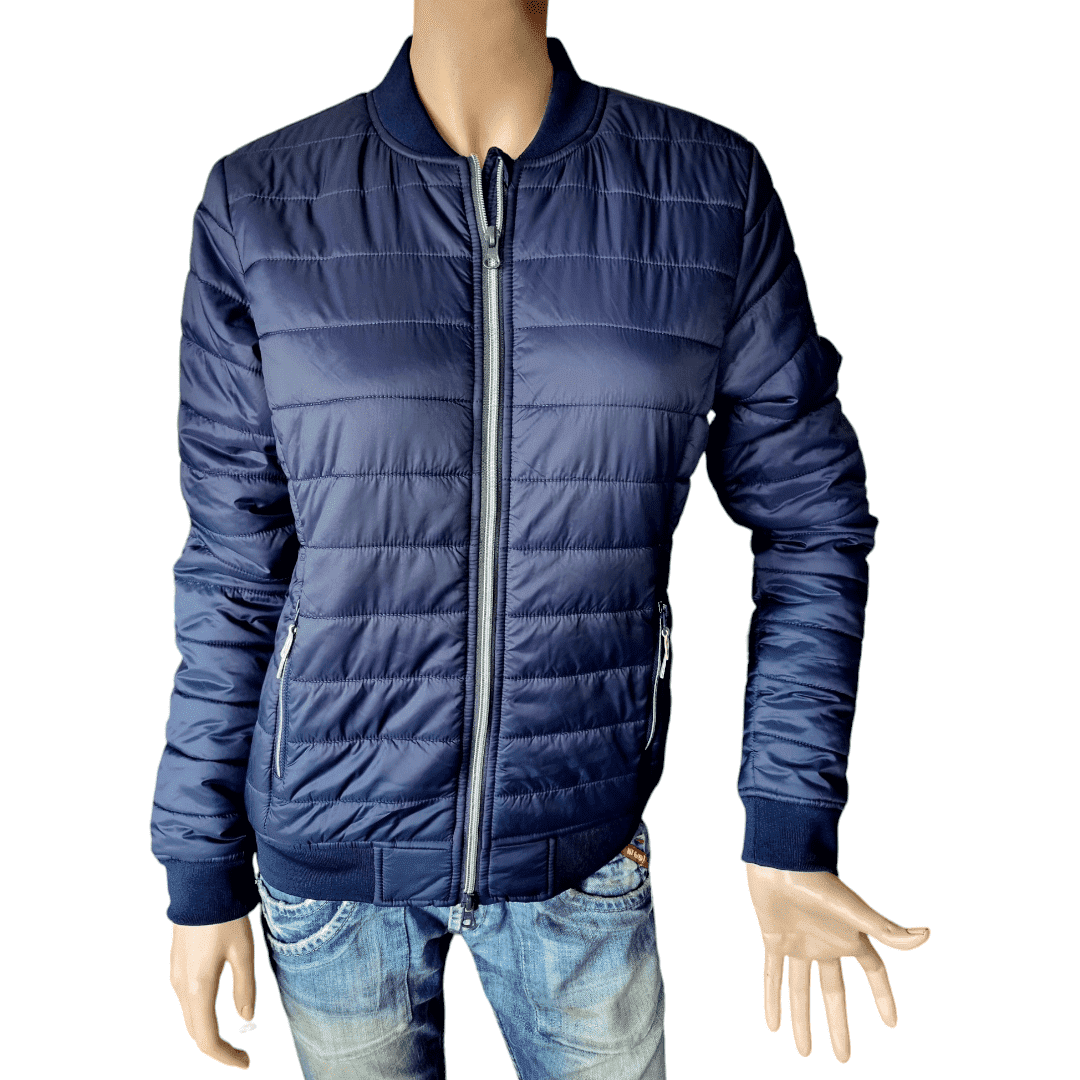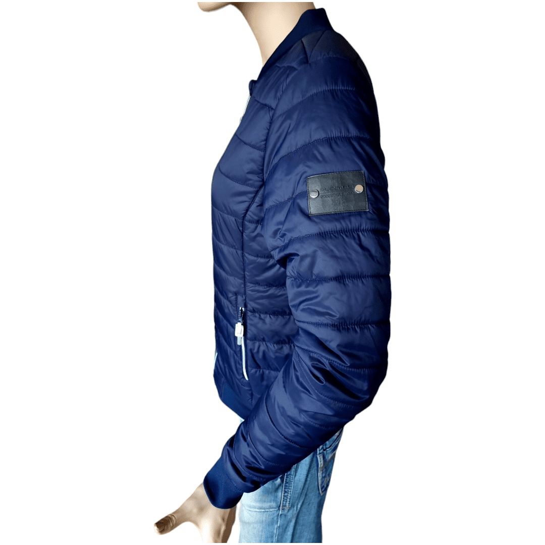 Cazadora acolchada de mujer en color azul marino. Bolsillos delanteros con cierre de cremallera. Cuello y puños elásticos. Forro interior en poliéster azul marino. Aplicación en manga izquierda. Material Poliéster.