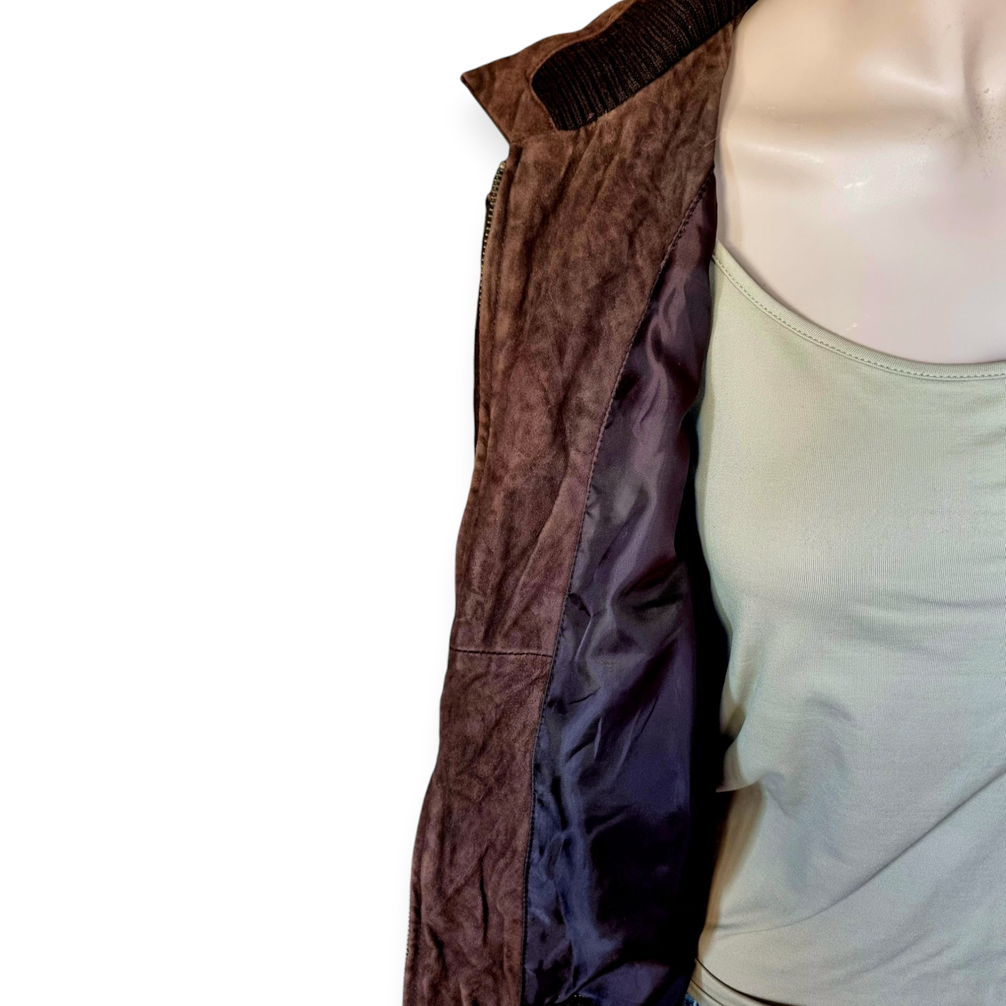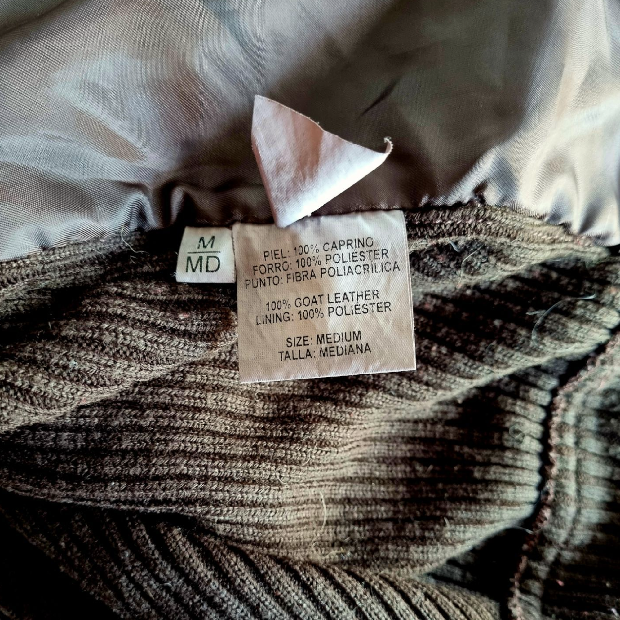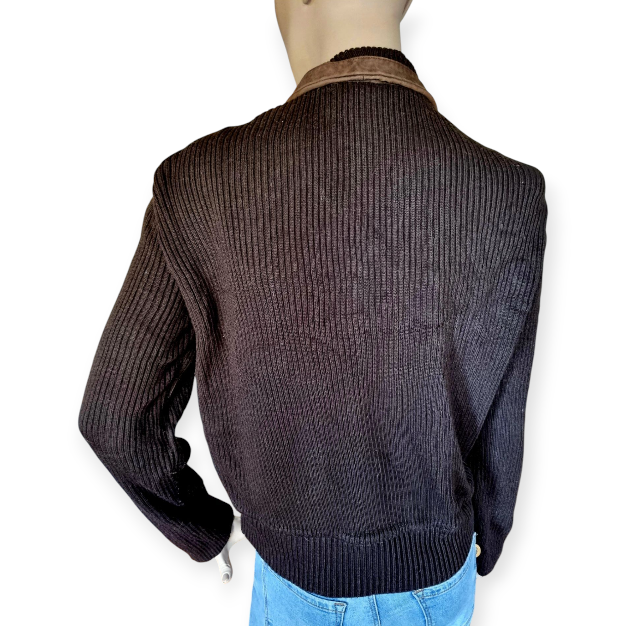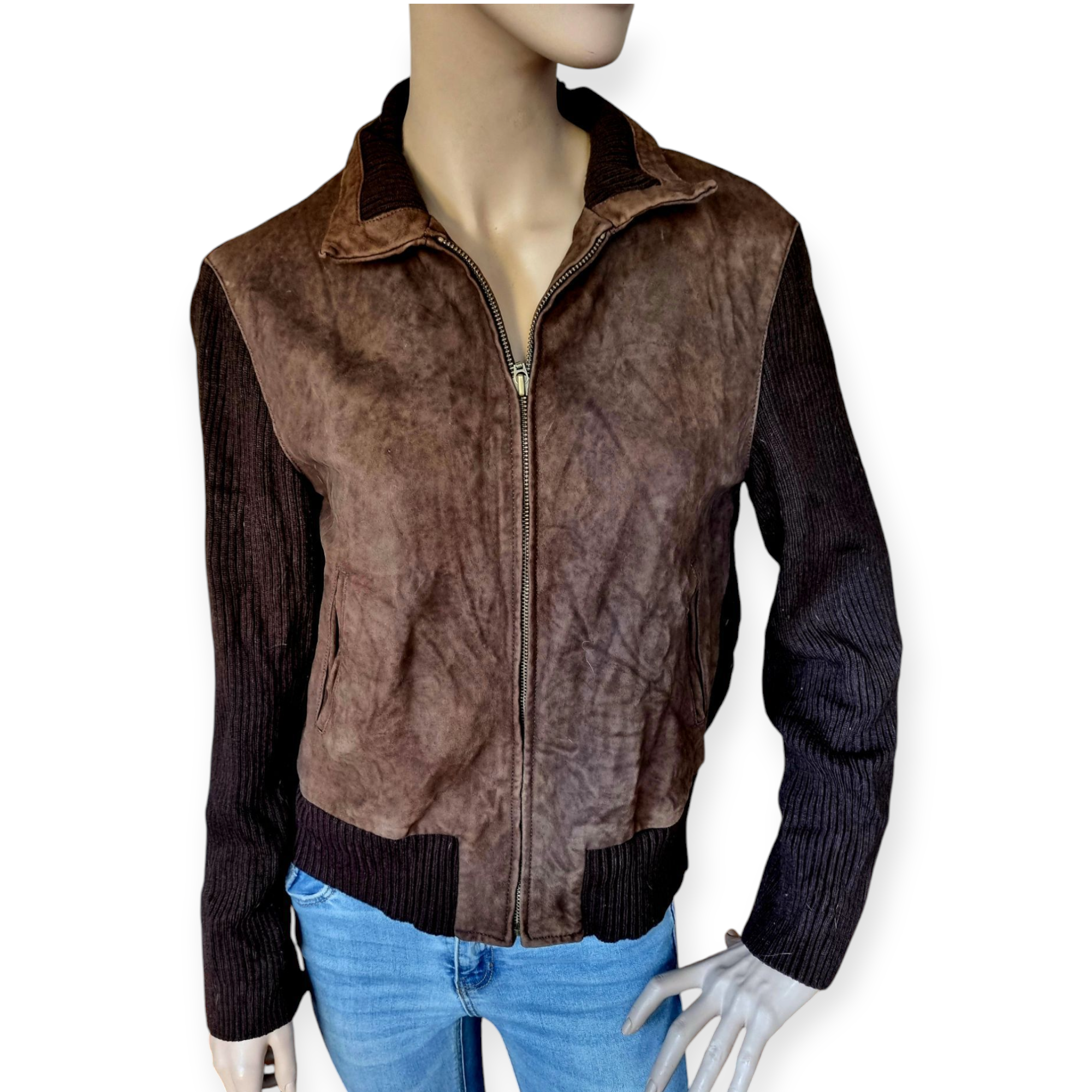 Cazadora de punto en canalé color marrón. Estilo Vintage, combina en su delantero tejido de piel de ganado caprino con punto. Cuello combinado y cierre de cremallera. Talla M / 38 / 10