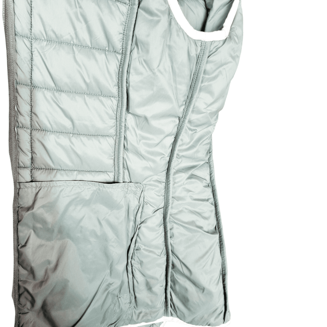 Chaleco estilo casual entallado en color verde. Vivo gris en mangas y caderas. Cierre de cremallera delantero. Bolsillos laterales con cierre de cremallera. Tejido no elástico. 100% poliéster.