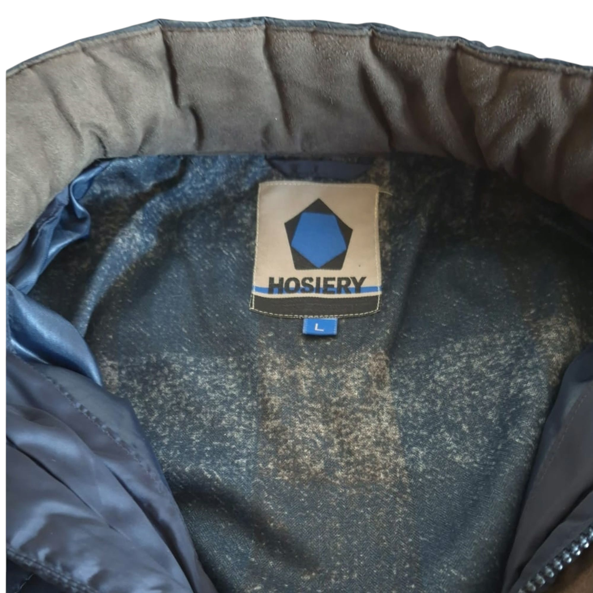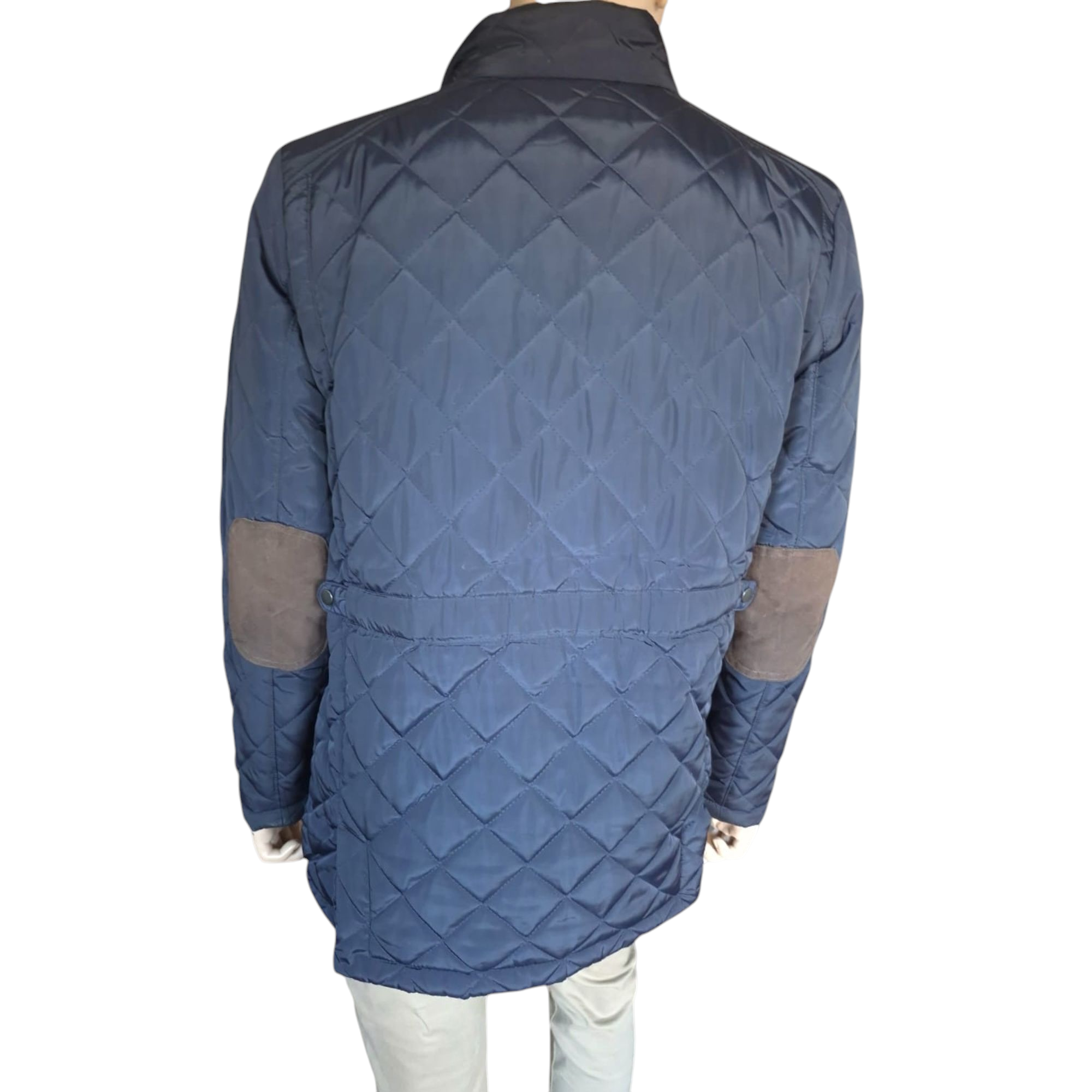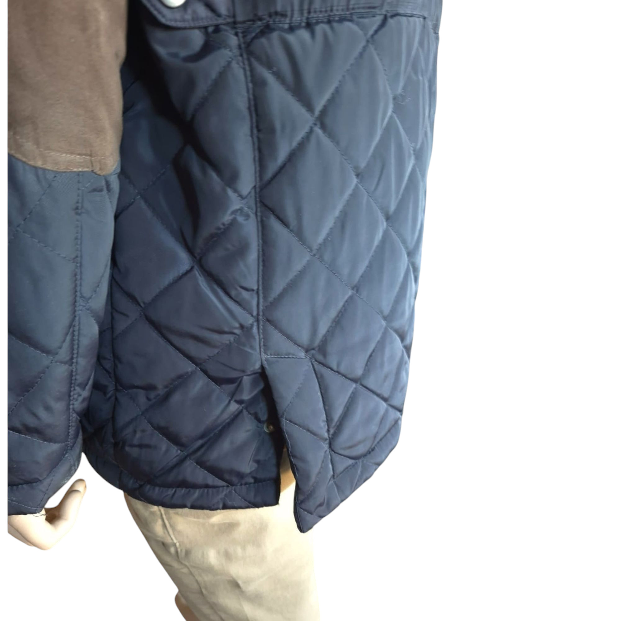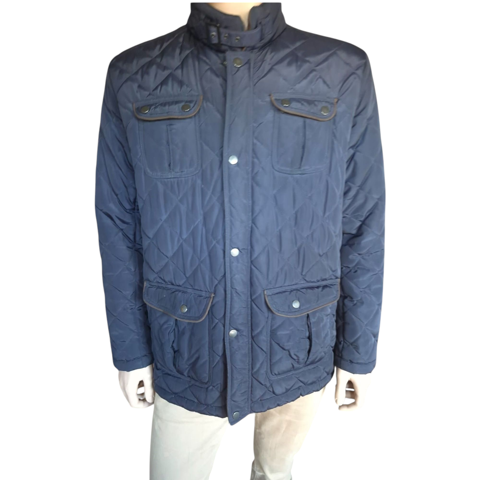 Chaqueta acolchada de hombre tipo » Husky » en color azul marino. Tejido exterior poliester. Forro interior algodón. Consta de dos bolsillos superiores y dos inferiores, cierre con tapeta y broches. Dispone en su interior de un bolsillo forrado. Cierre central con cremallera metalica y broches. Cuello interior, coderas y ribetes en » Moleskin «, color marron oscuro.