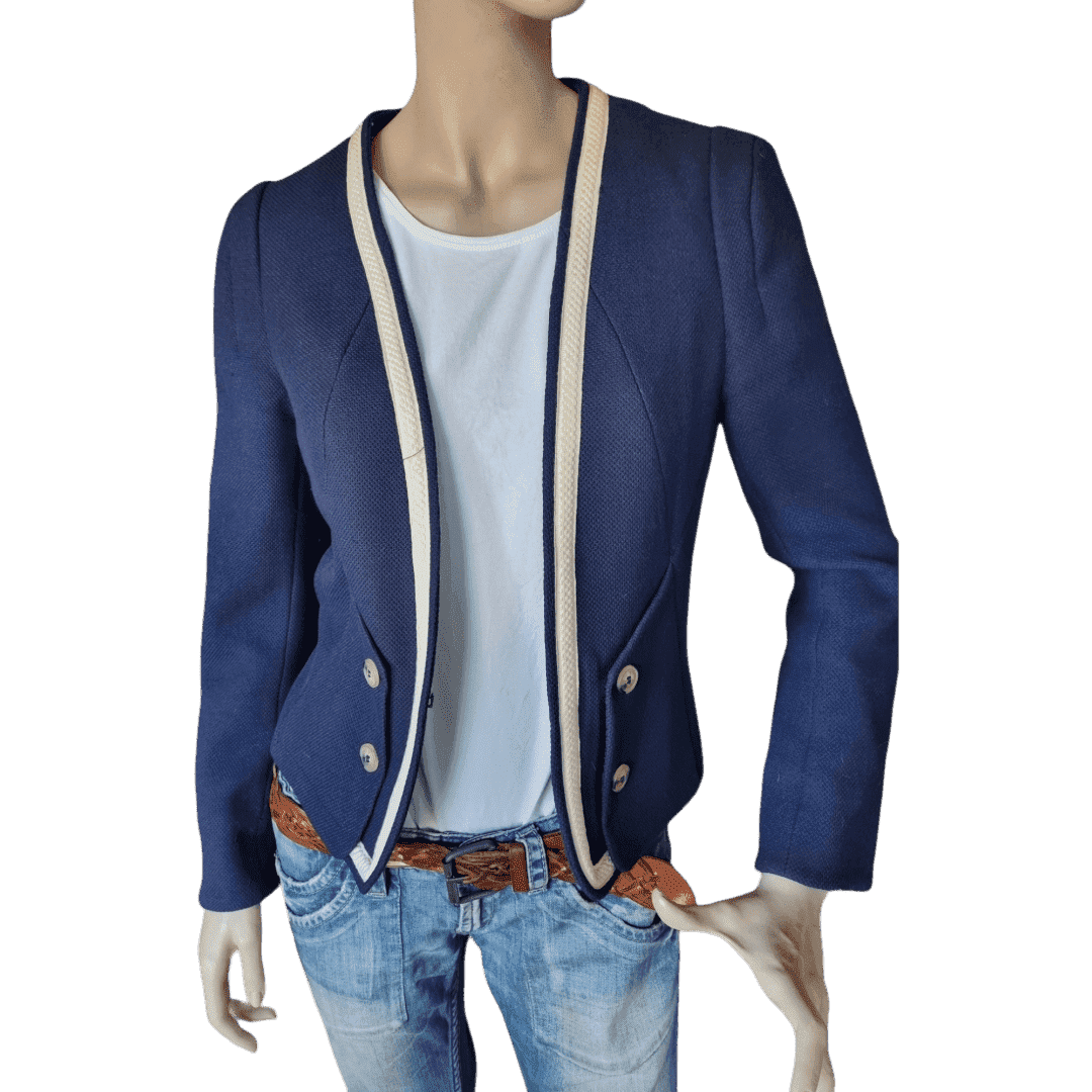 Este tipo de americana con botonadura tiene su corte por encima de la cadera. Se trata de una pieza que combina a la perfección con un estilismo sofisticado o incluso con uno más desenfadado como unos vaquero de talle alto. Color azul marino y botones en pasta. Ribeteada con un vivo en color crema y forro azul marino.