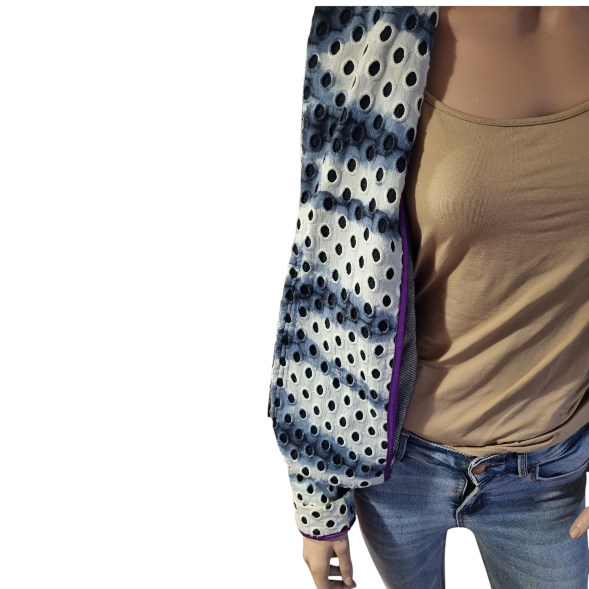 Chaqueta Custo de mujer. Doble tejido. Fondo vaquero y tela con topos sobrepuesta. Entallada y con cuello de solapa. Pequeño cierre de cremallera en delantero. Costuras internas ribeteadas en vivo morado.