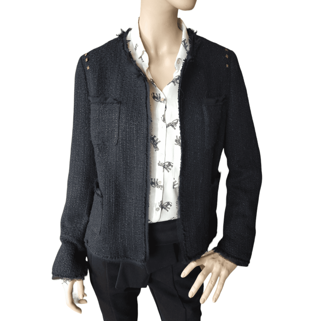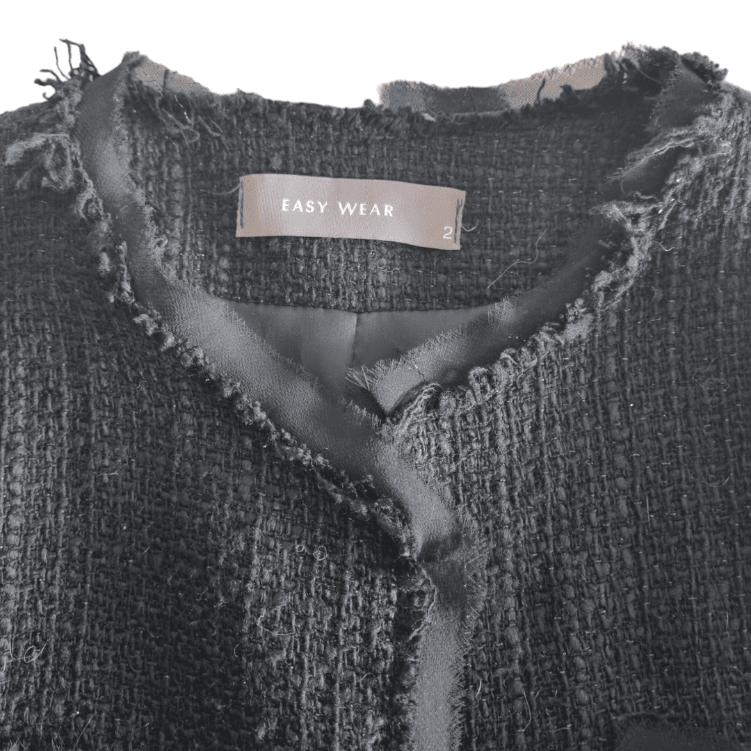 Chaqueta corta y negra, perfecta para el periodo de entretiempo. Se trata de un estilo retro que tiene un vivo de gasa negro transparente alrededor. Apliques metálicos en los hombros. Cuatro bolsillos de plastón en la parte delantera. Forro interior de poliéster. Material exterior 57% acrílico, 17% algodón, 16% poliéster y 10% lana. Talla M / 38 / 10