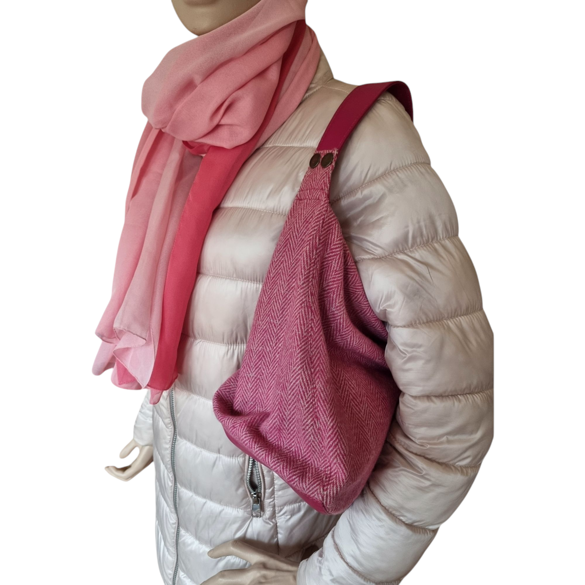 Conjunto de Bolso y Foulard en tonos Fucsia y rosa. Bolso combinado en piel color fucsia y tejido de lana y poliéster en dibujo de espiga. Forro 50% Algodón y 50% Viscosa. Base del bolso en piel.