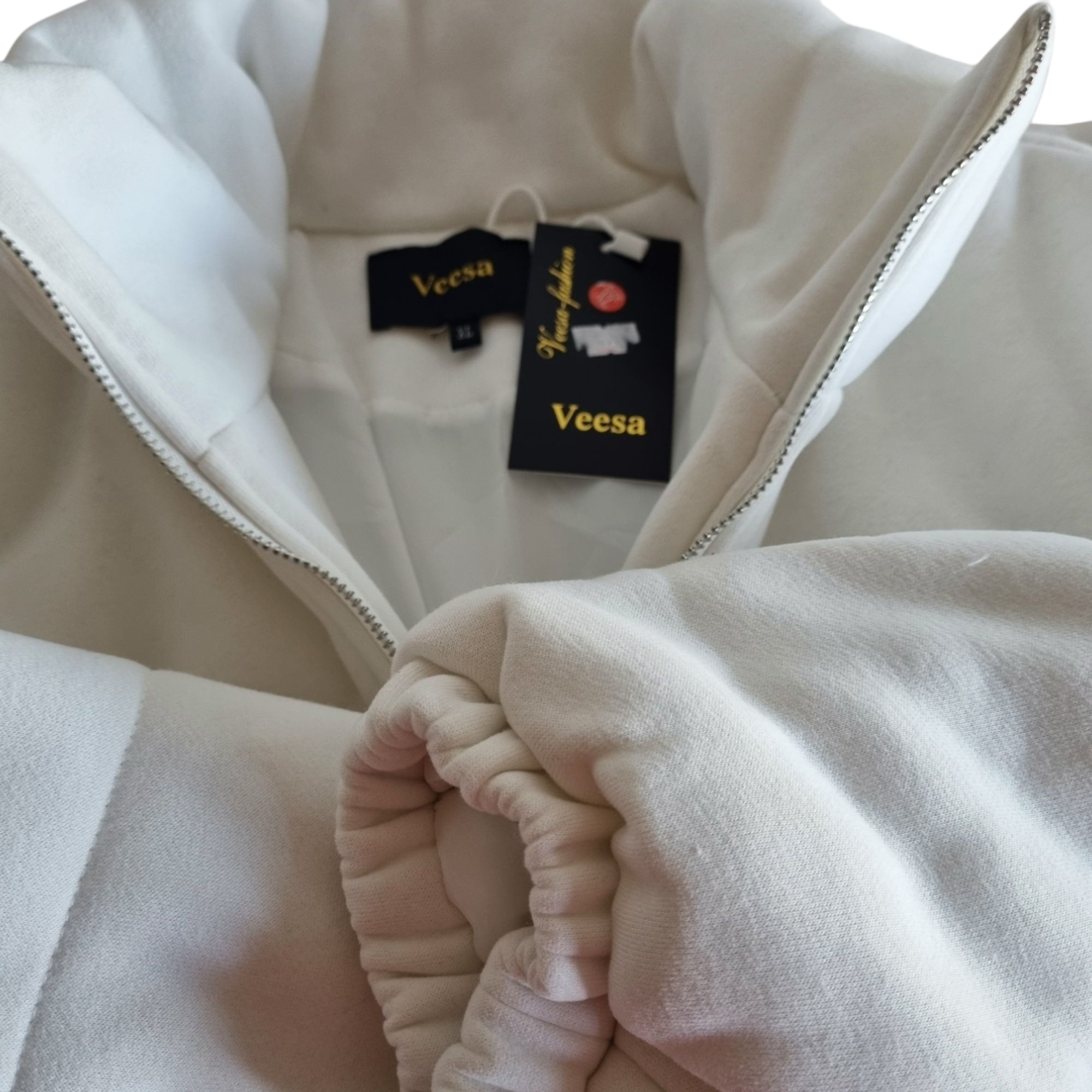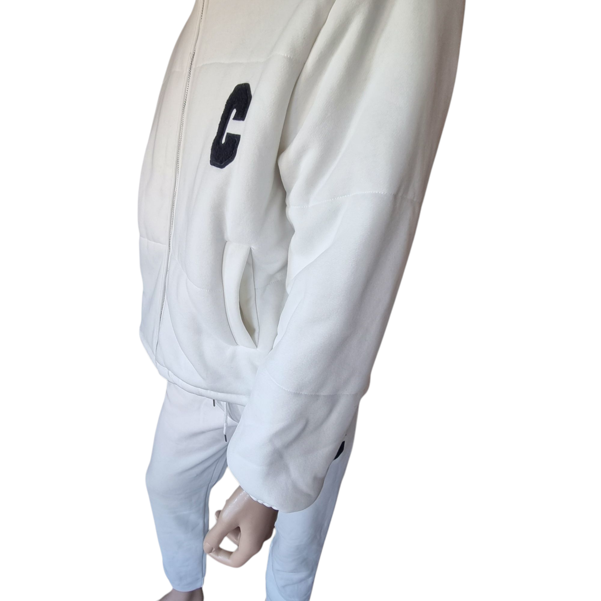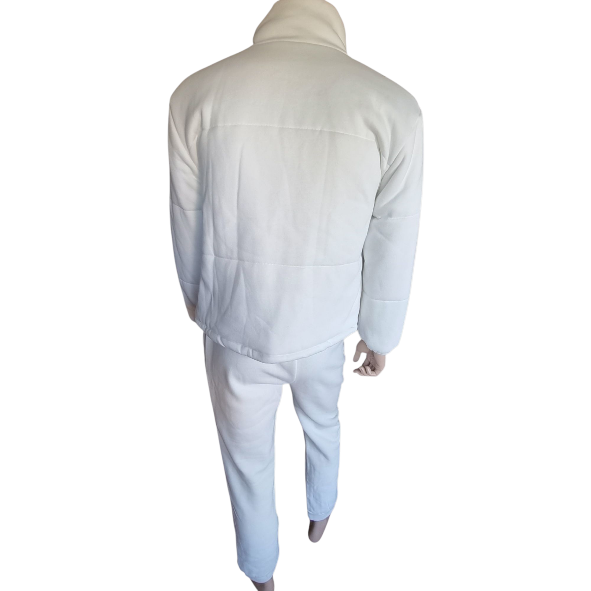 Conjunto sport de hombre en color blanco formado por cazadora acolchada con dos bolsillos laterales y cierre de cremallera. Puño de la manga fruncido con goma. Cuello subido. Interior de nailon. Pantalón chándal con goma y cordón. Bajo terminado en puño. Talla XL justa equivale a una L amplia.