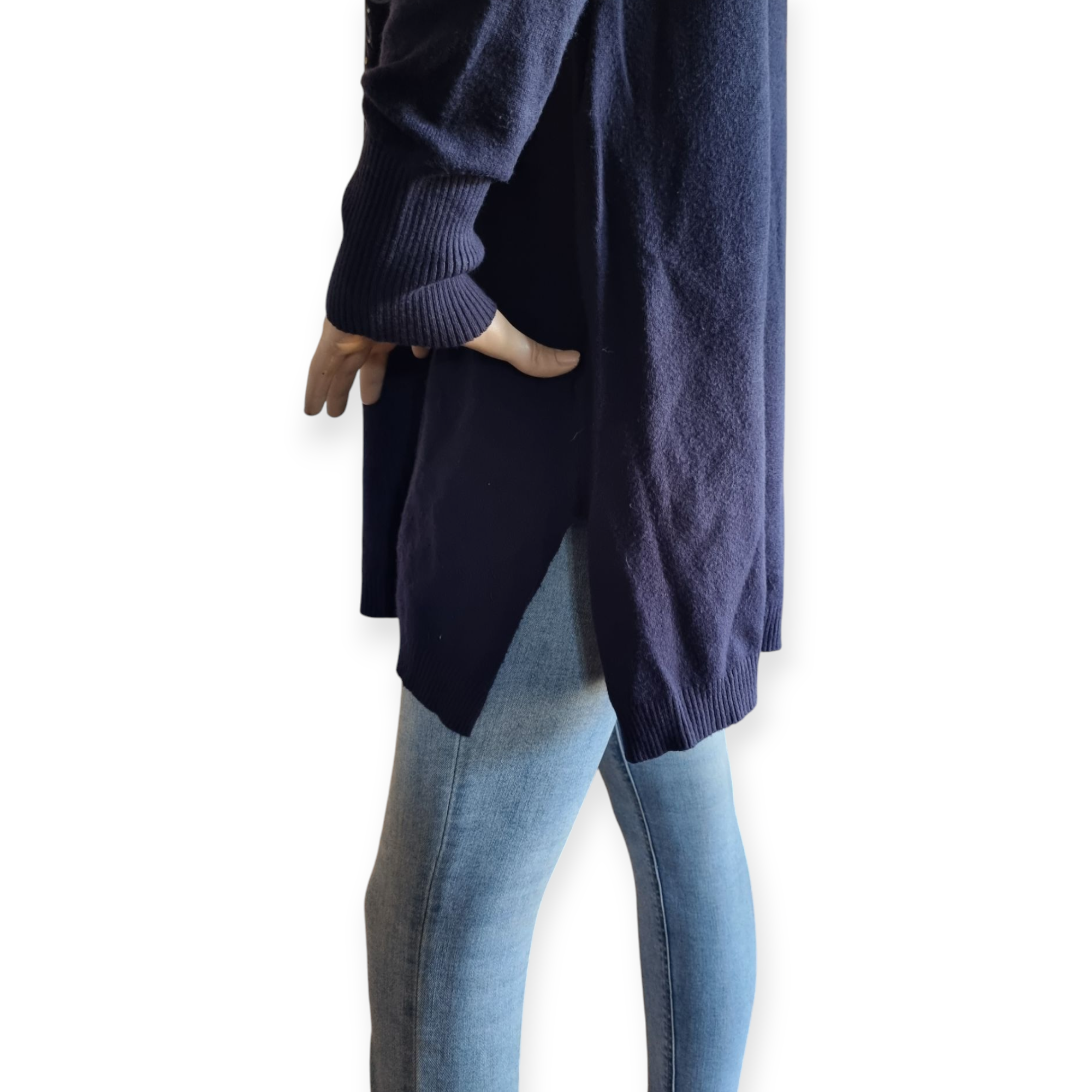 Jersey largo en punto azul marino. Posibilidad de utilizar, por su largo, como vestido. Cuello redondo y manga larga. Dibujo en delantero en tono azul mas claro y apliques de pedrería. Dos pequeñas aberturas laterales. Talla XL / 42 / 14