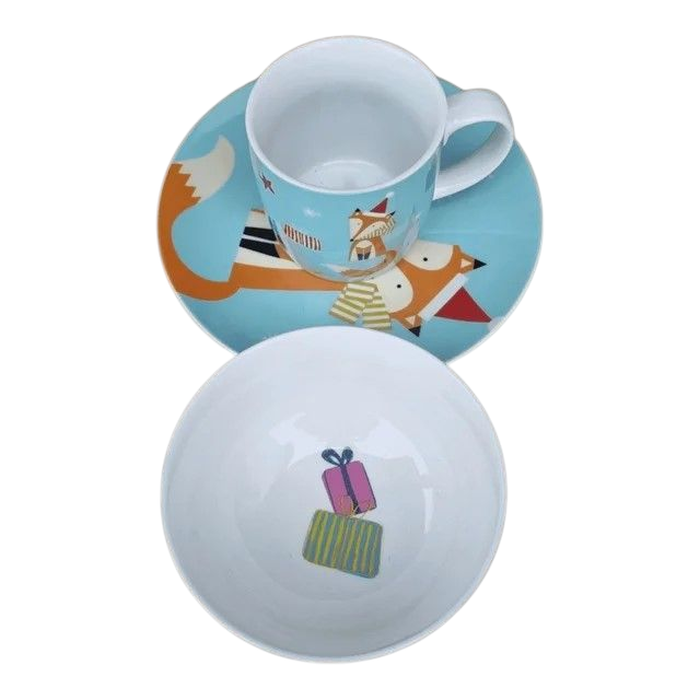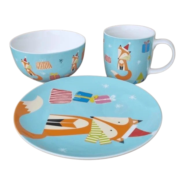 Set infantil compuesto por un plato, Bol y taza diseñados para ser muy fáciles de agarrar, fabricados en porcelana. Destaca su colorido estampado con un zorro y diversos regalos, muy atractivo para los más pequeños de la casa. Viene presentado en un elegante estuche. Capacidad 250ml