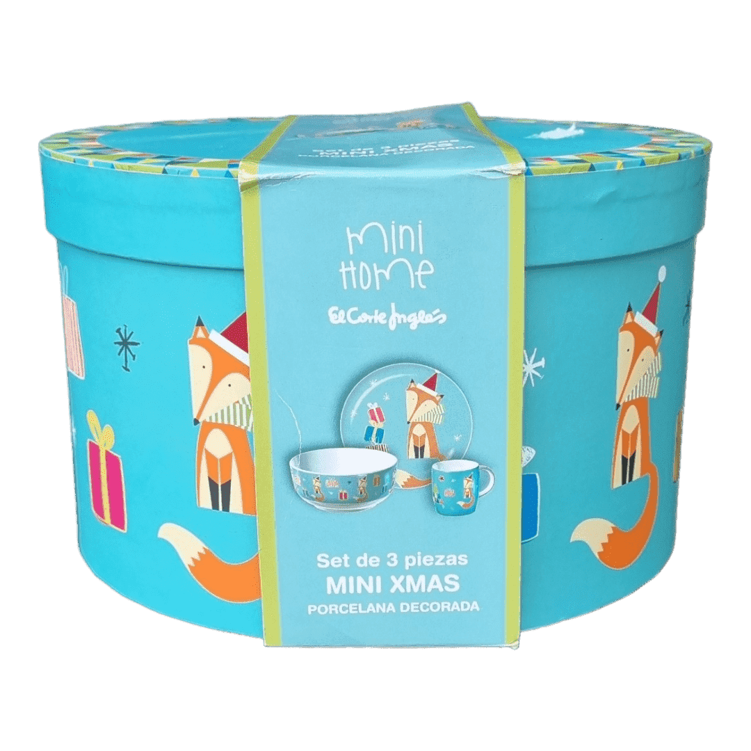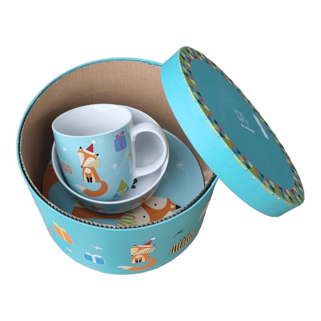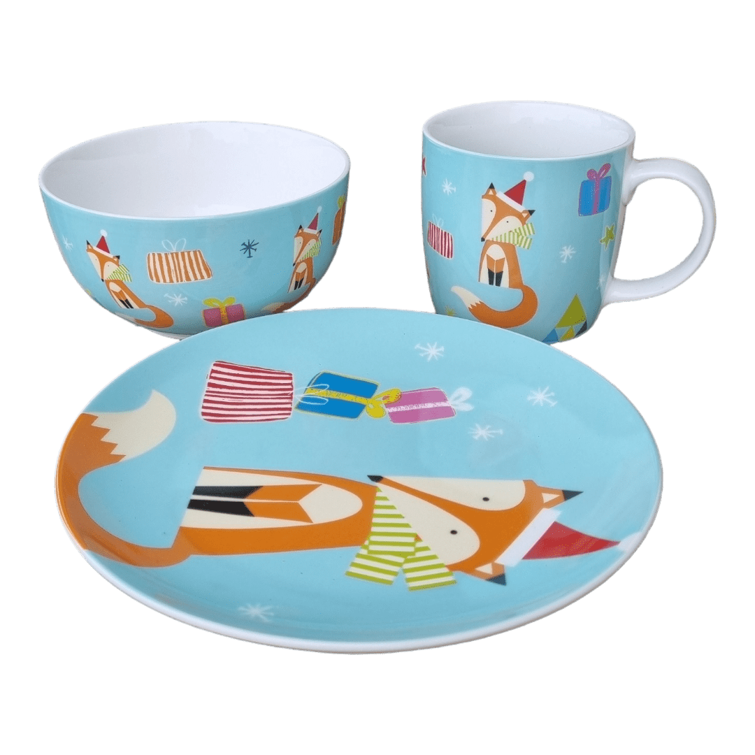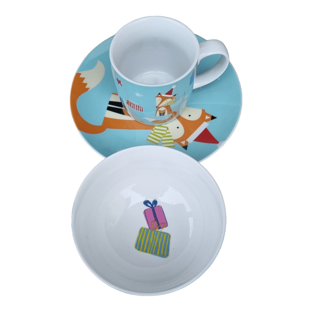 Set infantil compuesto por un plato, Bol y taza diseñados para ser muy fáciles de agarrar, fabricados en porcelana. Destaca su colorido estampado con un zorro y diversos regalos, muy atractivo para los mas pequeños de la casa. Viene presentado en un elegante estuche.