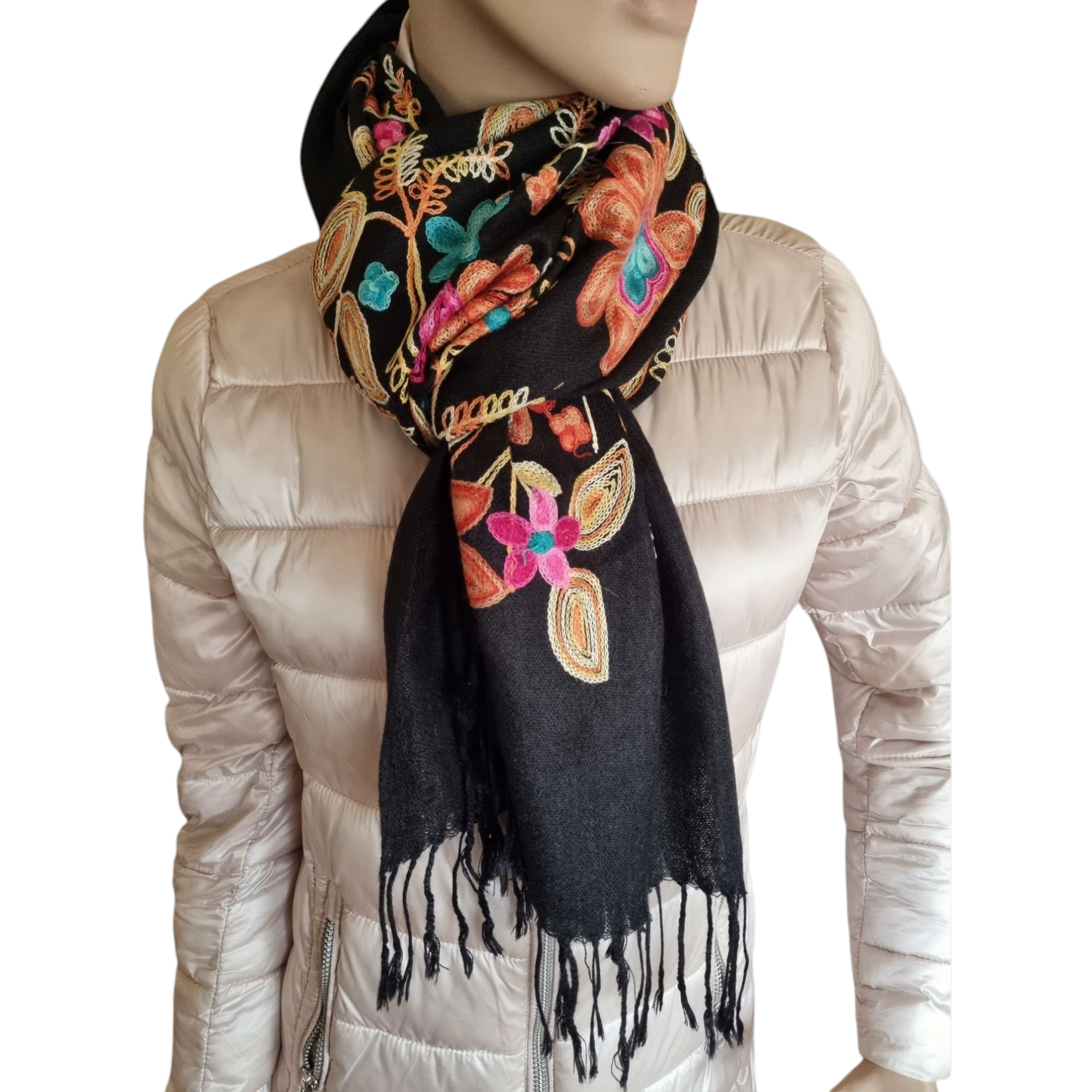 Pashmina Bordada que complementara muy con cualquier atuendo. Su tamaño permite usarlo como chal o bufanda para el cuello. Fondo negro con bordado floral multicolor, rematado en flecos.