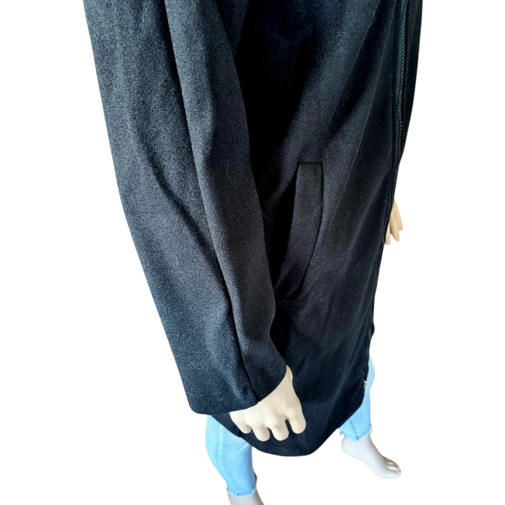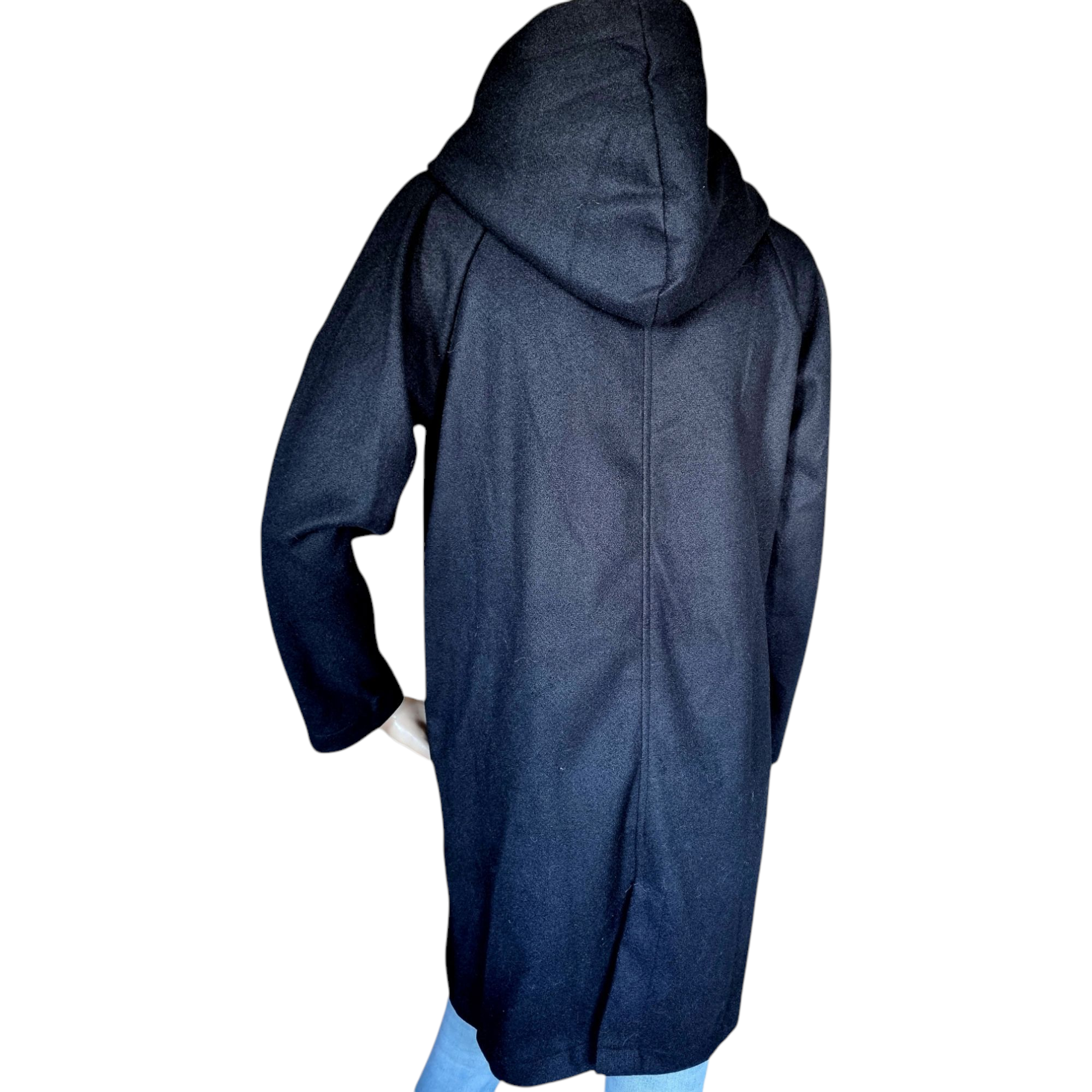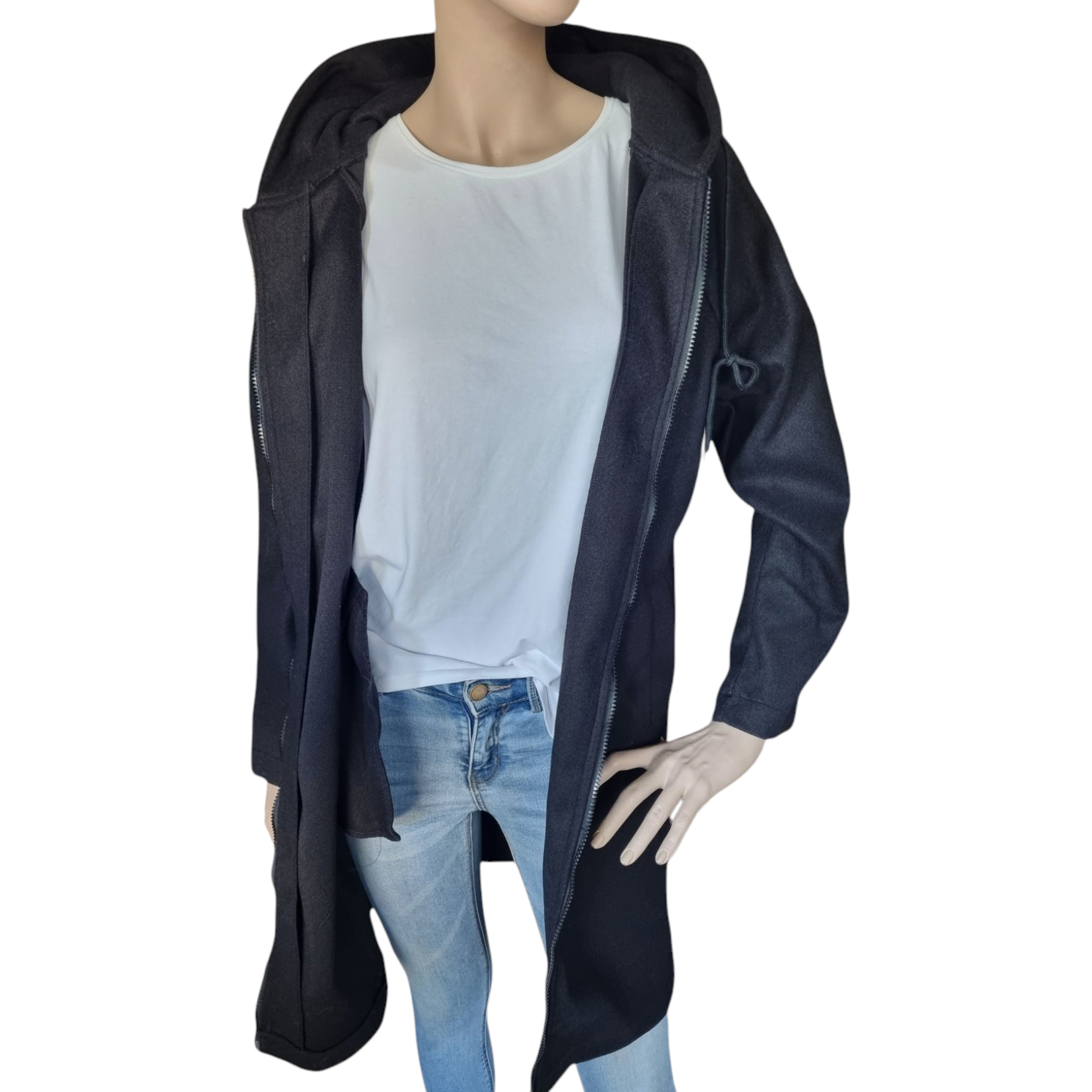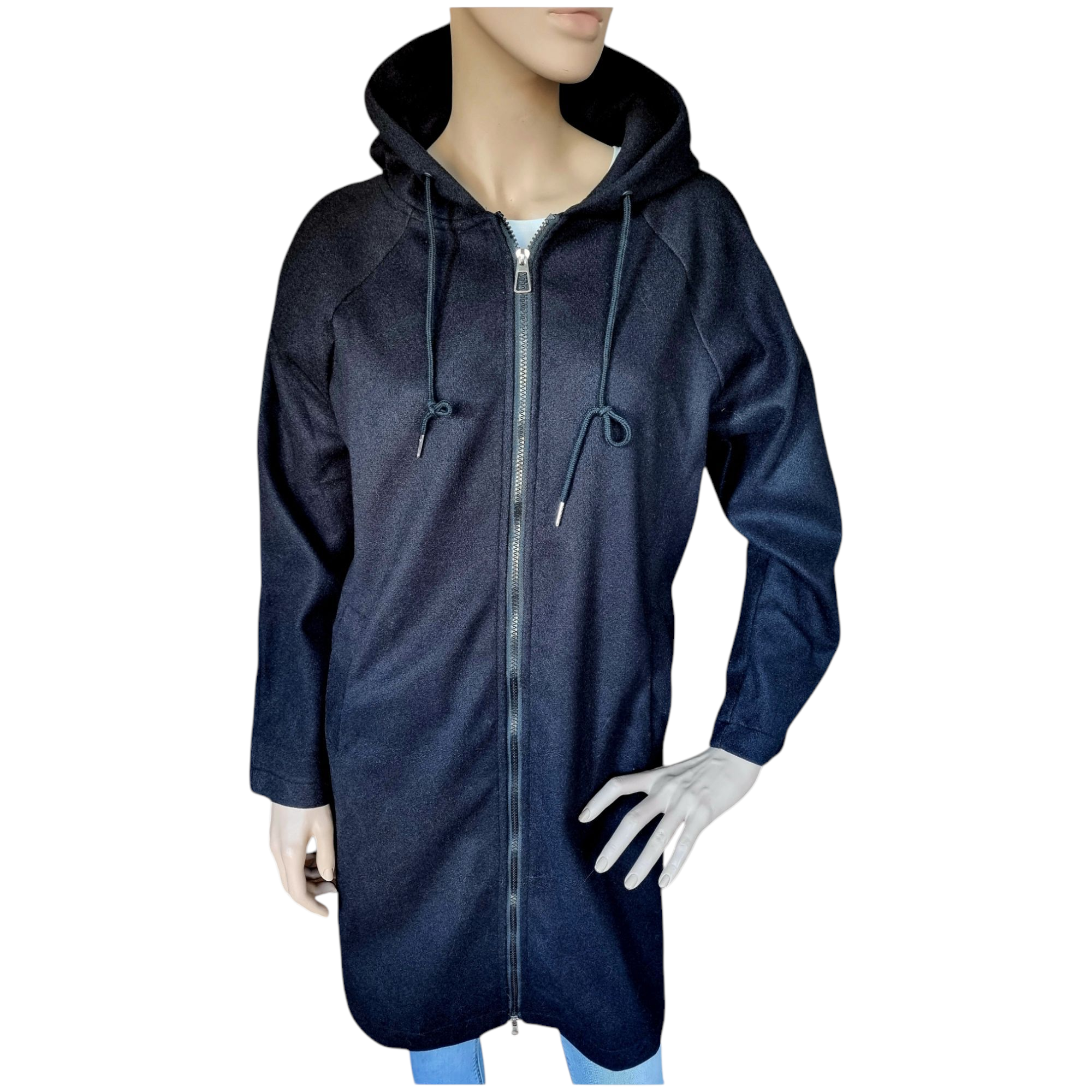 Prenda abrigo para mujer con capucha. Tejido fino de paño y punto interior. Cierre de cremallera. Dos bolsillos laterales. Pequeña abertura trasera. Manga ranglan. No tiene forro interior. Talla M / 38 / 10