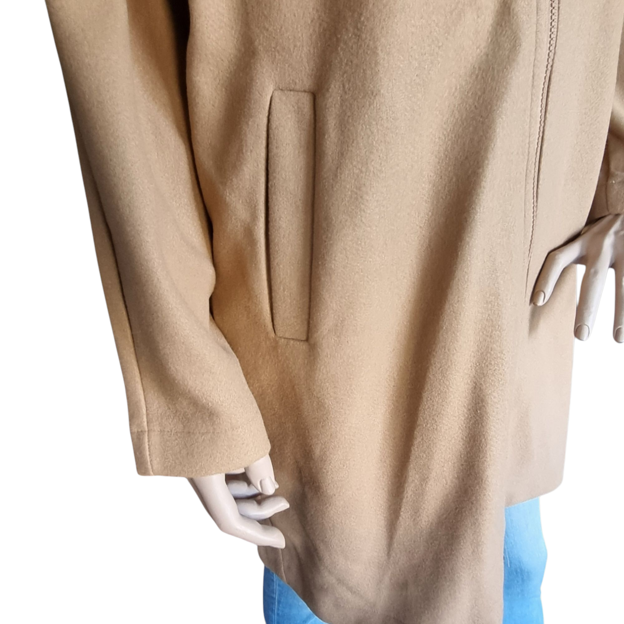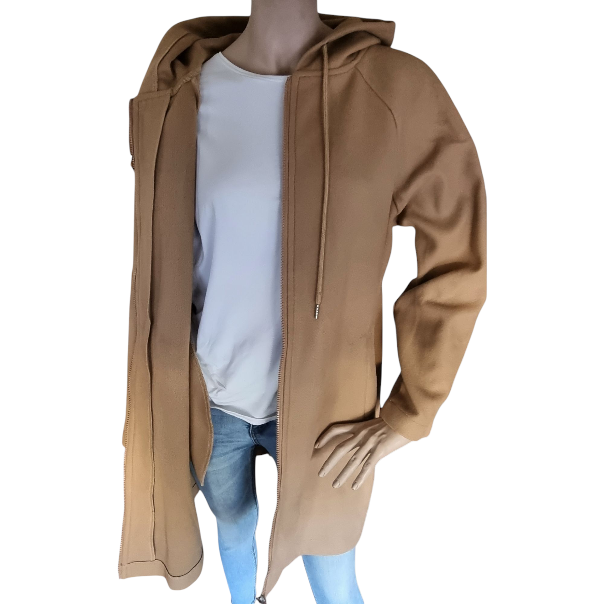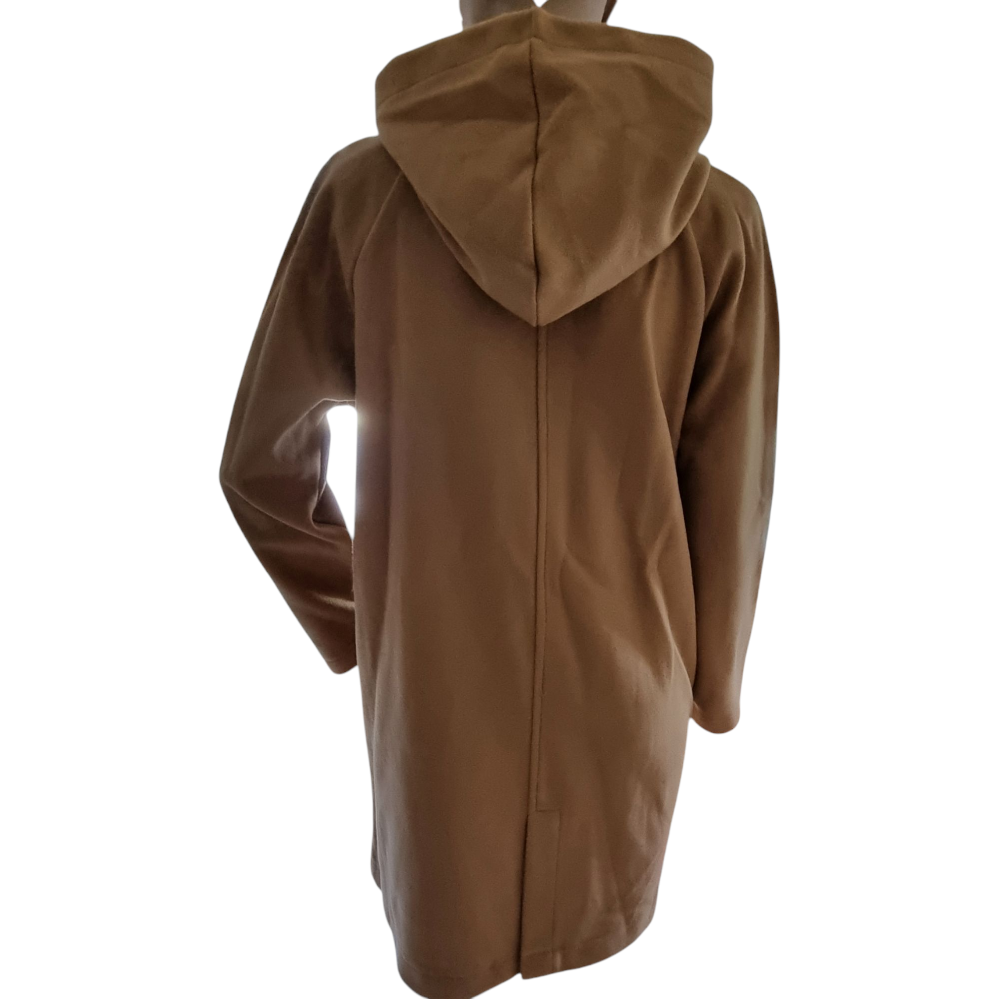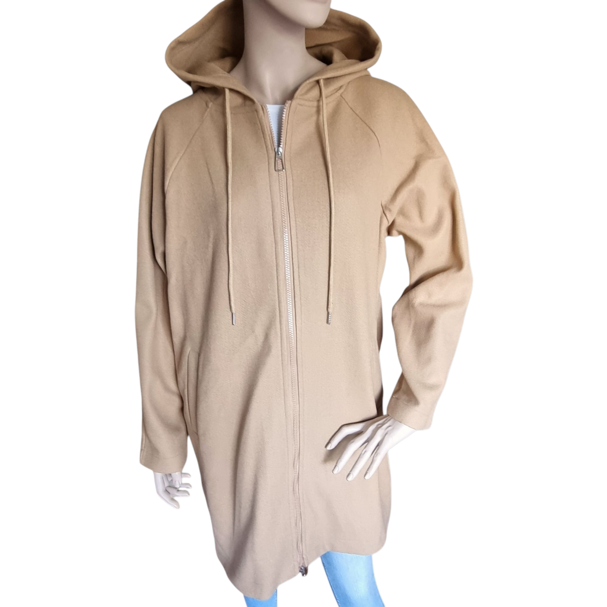 Prenda de abrigo para mujer con capucha. Tejido fino de paño y punto interior. Cierre de cremallera. Dos bolsillos laterales. Pequeña abertura trasera. Manga ranglan. No tiene forro interior. Talla L / 40 / 12