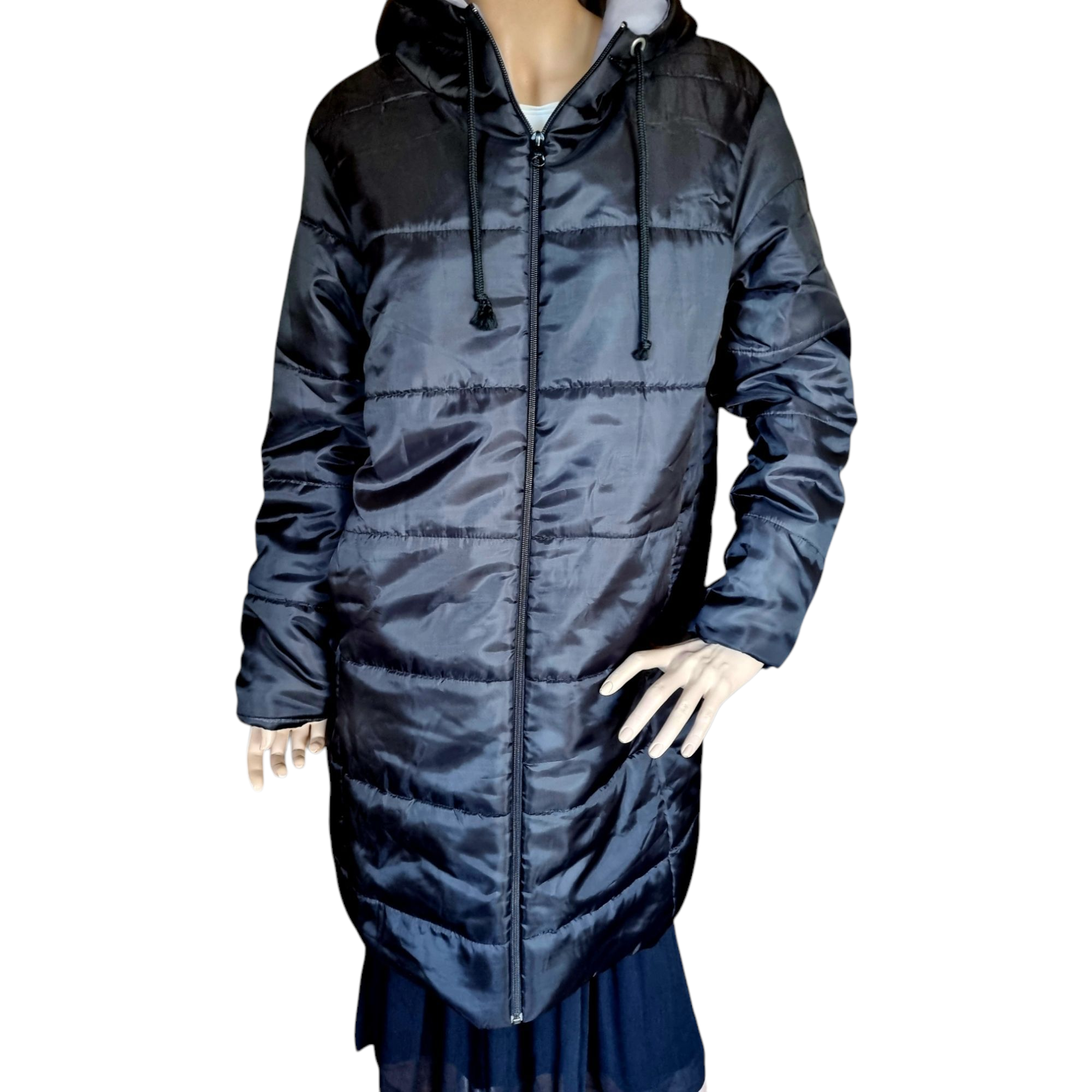 Abrigo acolchado en color negro. Interior en color gris. Dos bolsillos laterales exteriores con cierre de cremallera. Capucha ajustable con cordón. Talla XL
