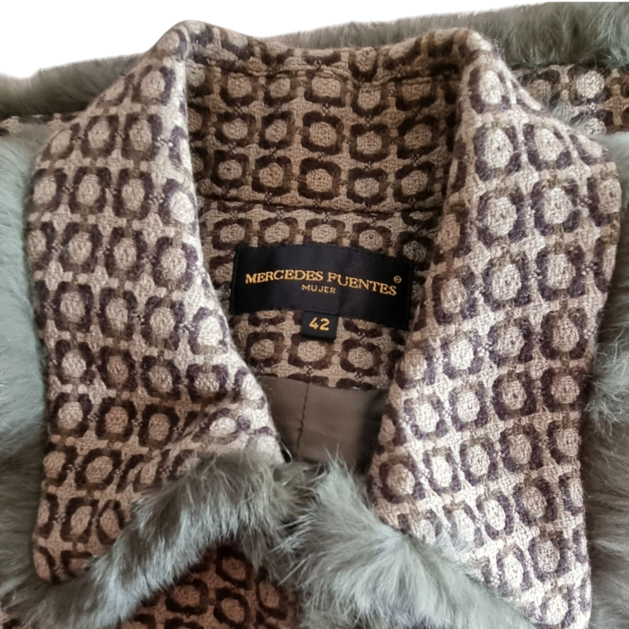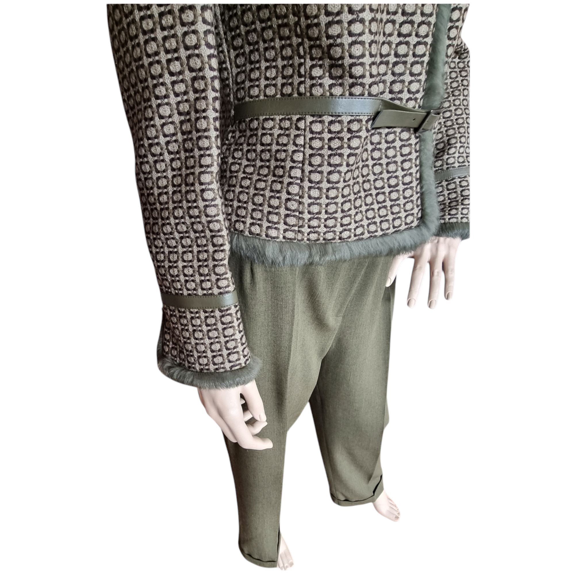 Traje pantalón de mujer en tono caqui y tostado. Confeccionado en lana. La chaqueta es semi entallada con cuello de solapa corta. Delantero y mangas ribeteado en pelo teñido en color verde. Tiene un cinturón cosido en la parte delantera en piel color verde. Las mangas tienen una pequeña abertura lateral y aplique de piel en color verde. Toda forrada en interior en acrílico verde.