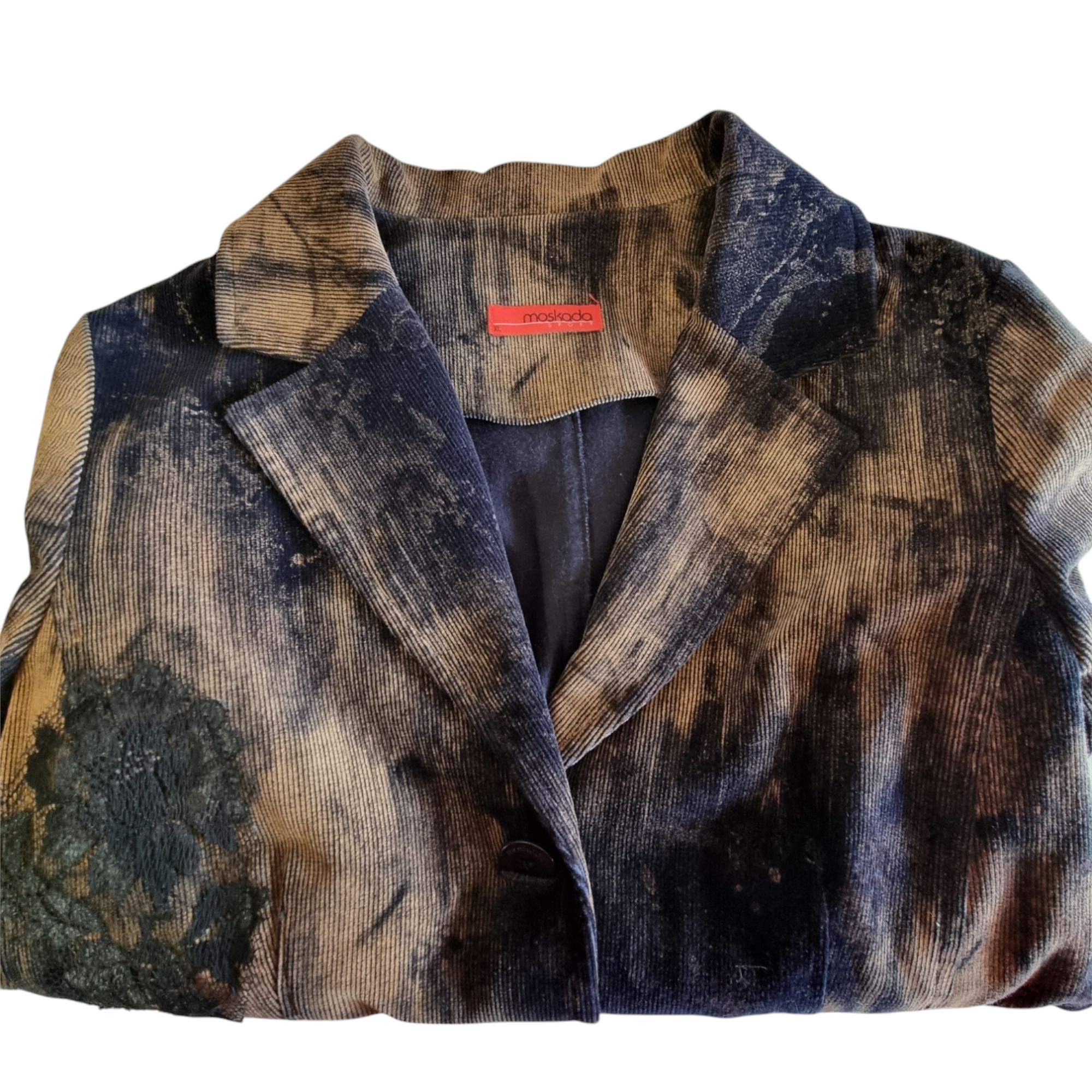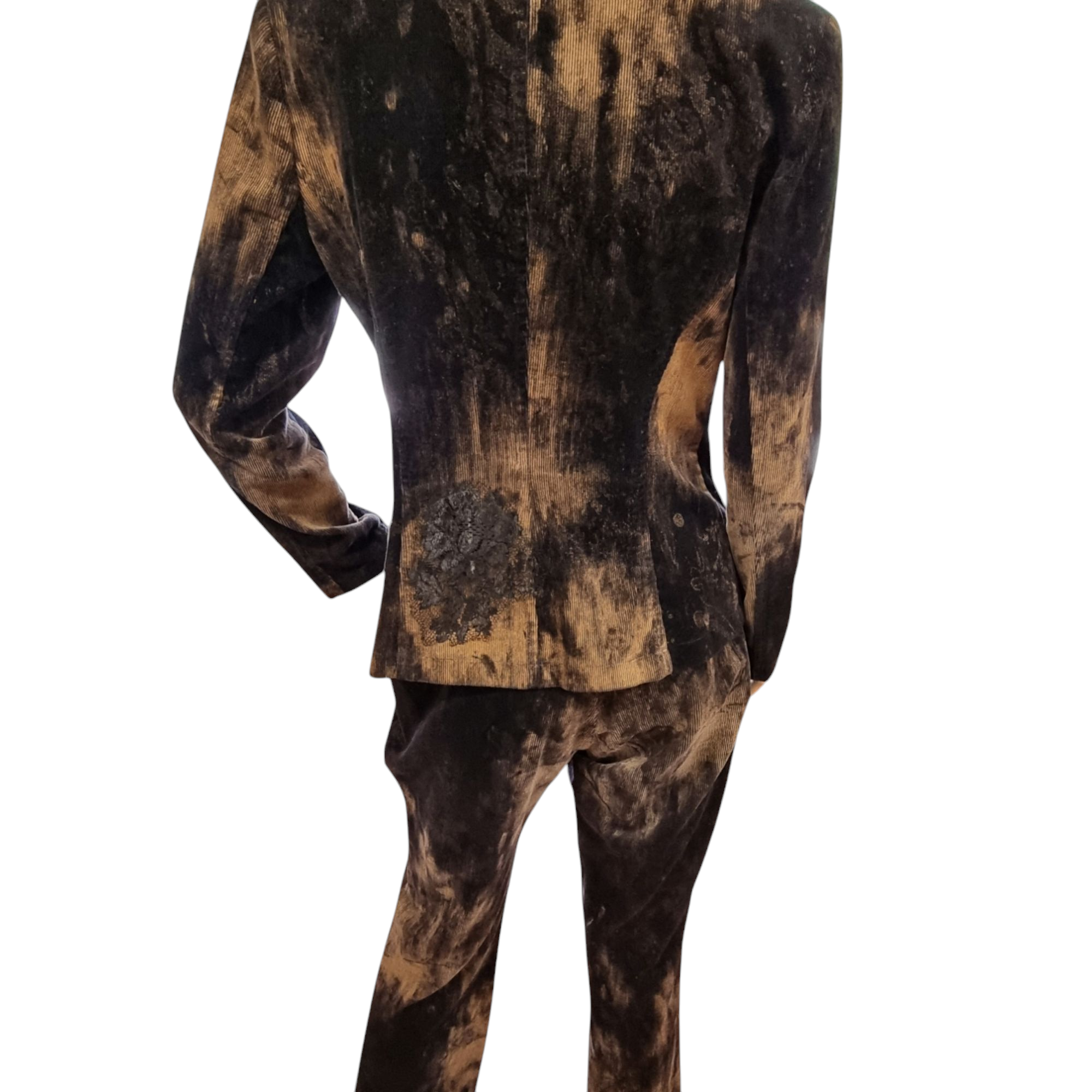 Traje pantalón en pana estampado. Chaqueta entallada con aplicaciones de encaje en color negro. Dos bolsillos delanteros. Cuello pico con solapa.