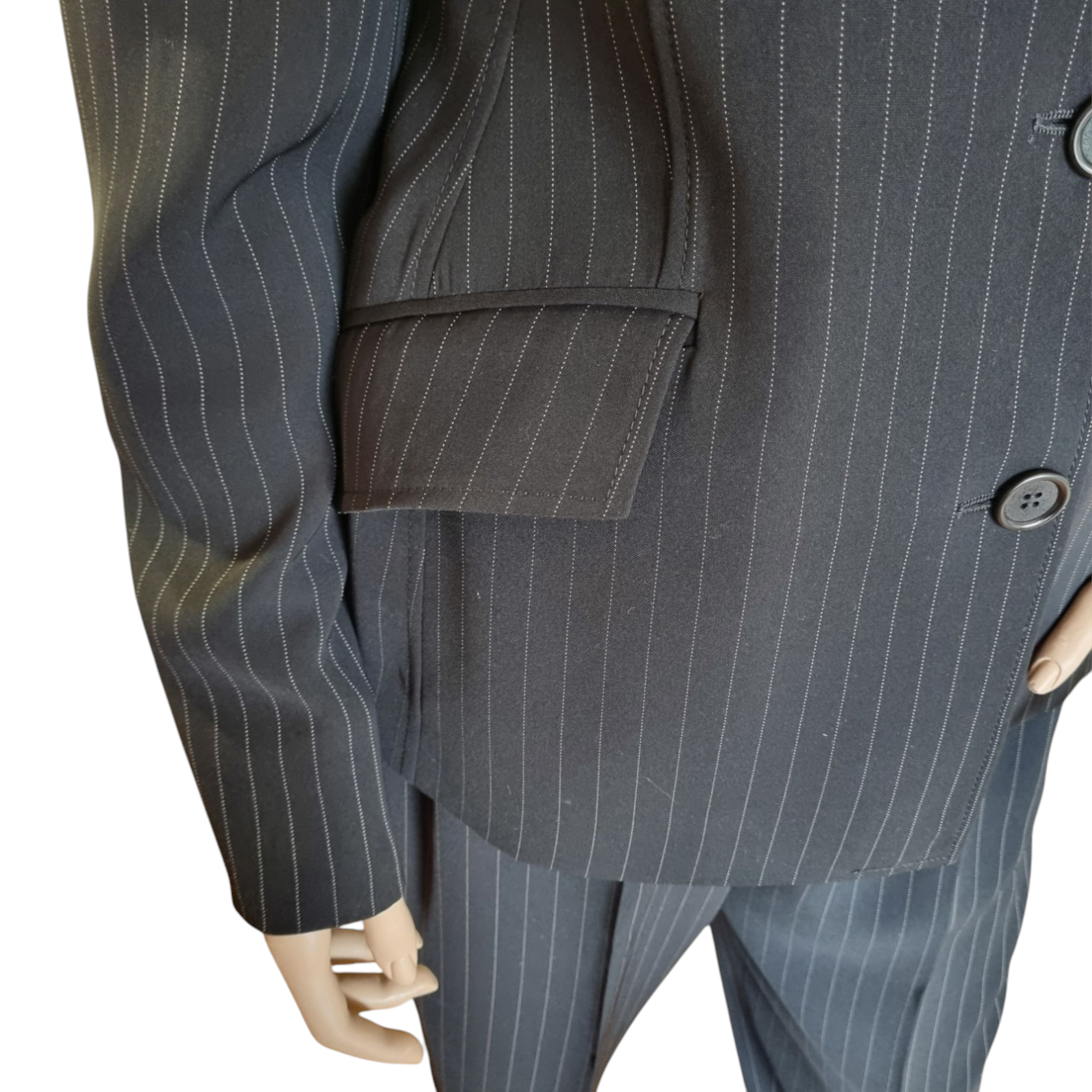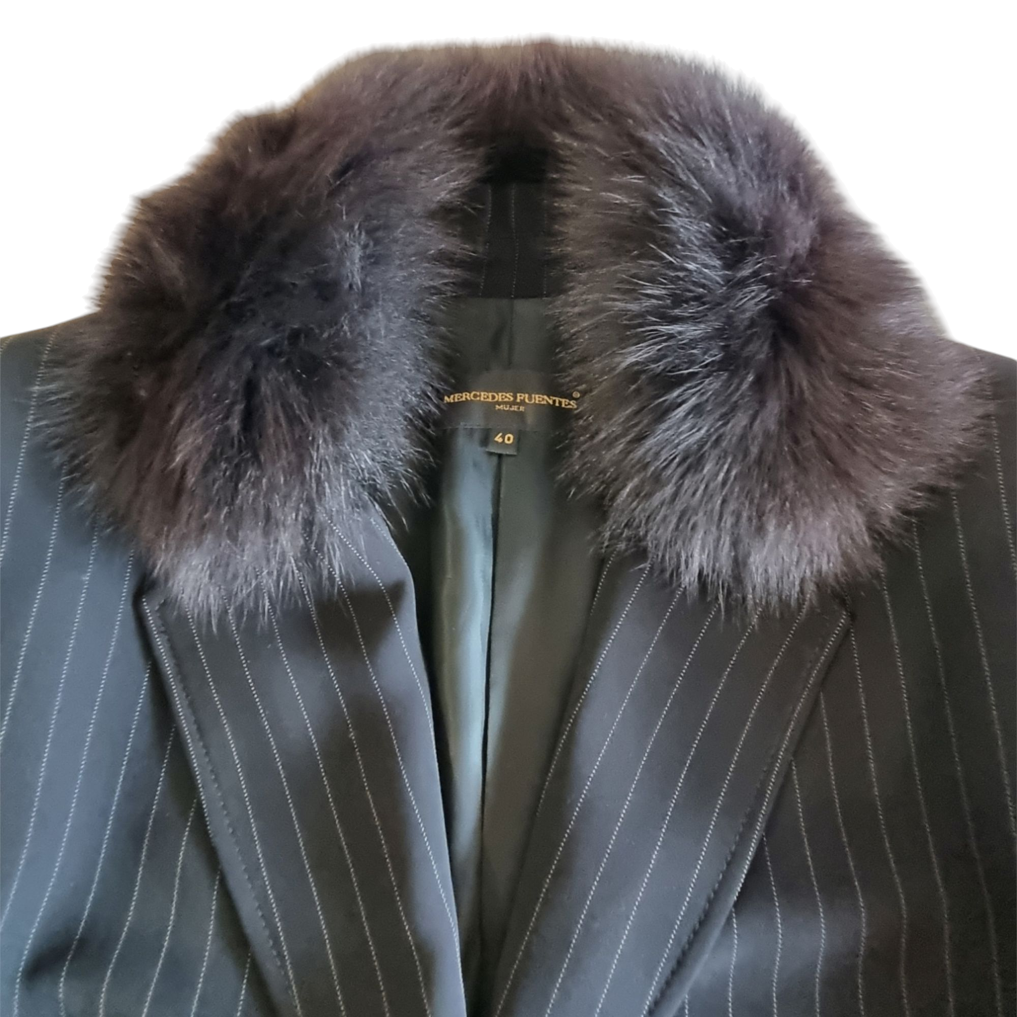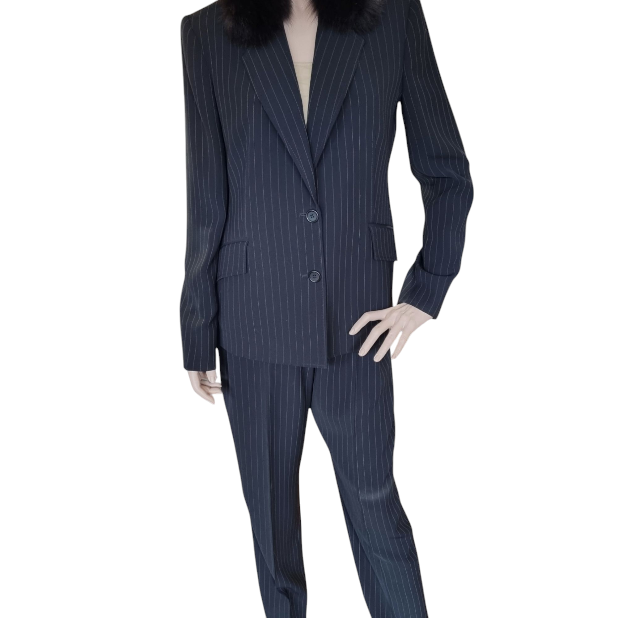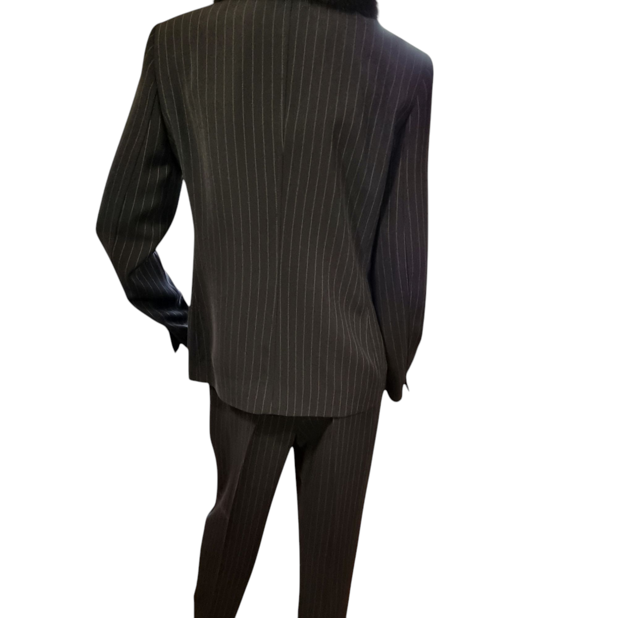 Traje pantalón raya diplomática en crepe de lana color negro. Chaqueta entallada con dos falsos bolsillos delanteros con tapa. Cuello esmoquin con aplique en visón. Ancho de espalda 42 cm, Largo desde el cuello 65 cm, Ancho entre axilas 46 cm, Largo de manga 62 cm.