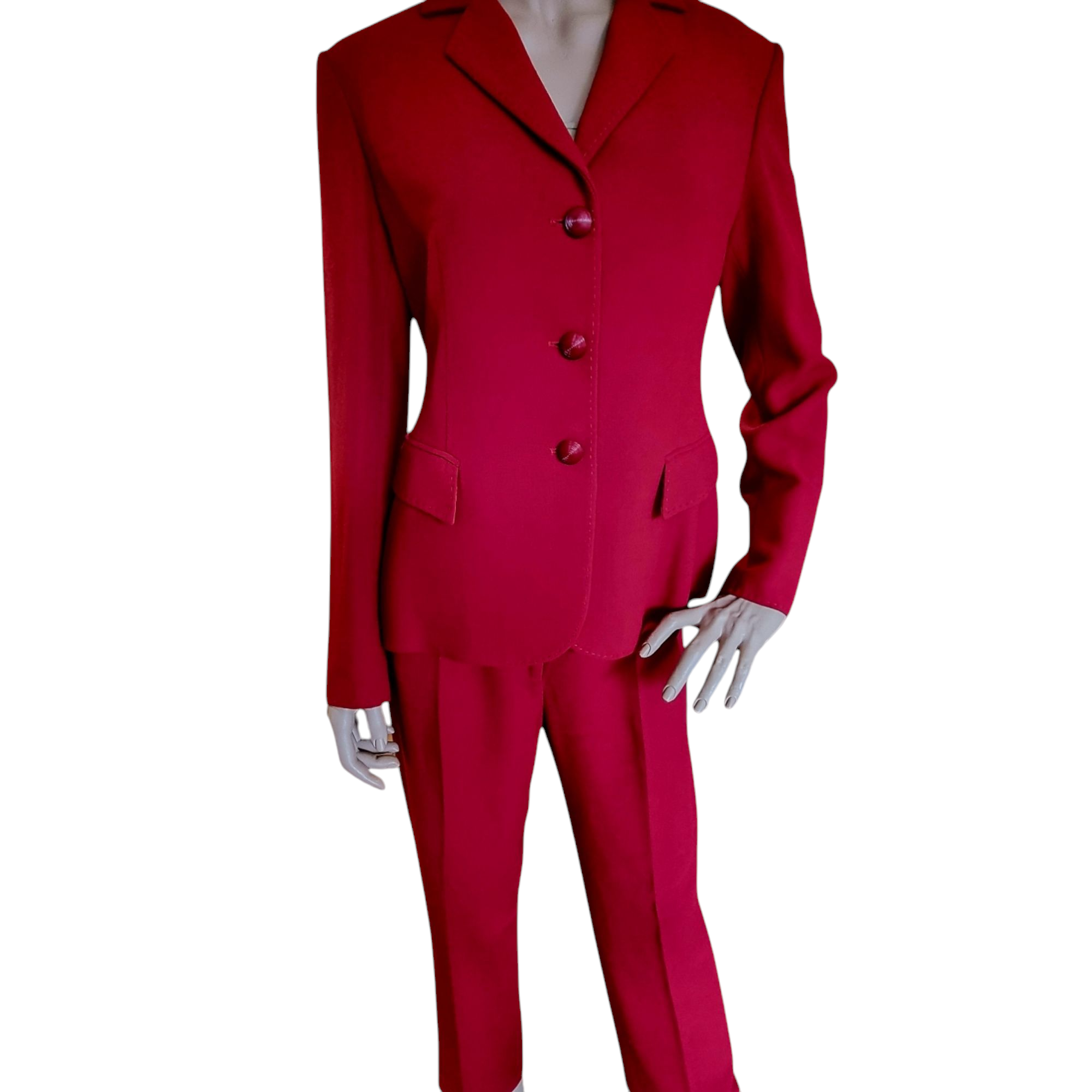 Traje pantalón de mujer en color rojo confeccionado en crepe de lana. La chaqueta es entallada con cuello pico. Toda pespunteada en hilo de color rojo. Interior de la chaqueta forrada en acrílico rojo. Dos bolsillos con solapa en delantero.