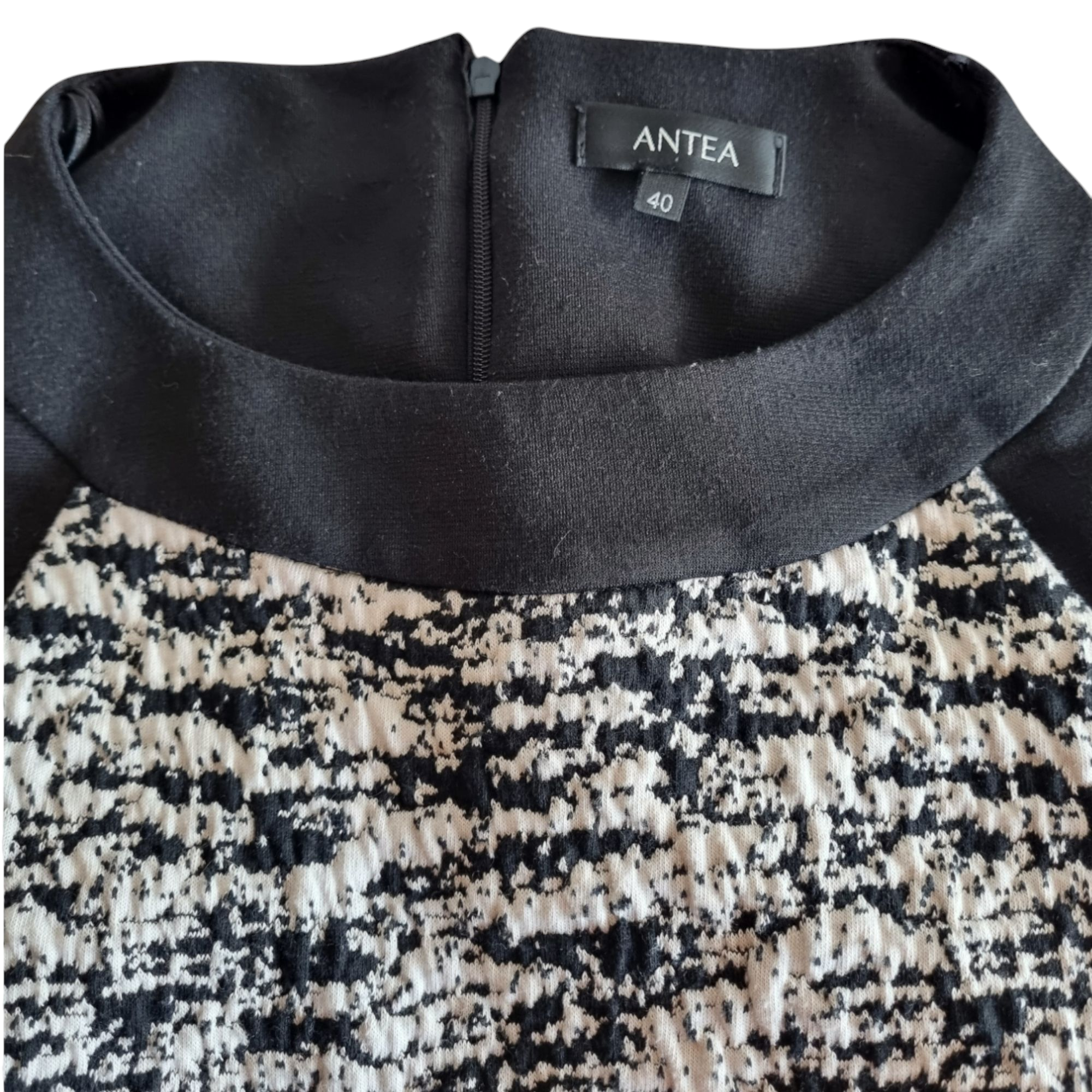 Vestido ajustado para mujer en punto negro y blanco. Cuello redondo y manga francesa. Cierre de cremallera en la espalda y pequeña abertura en la parte trasera.