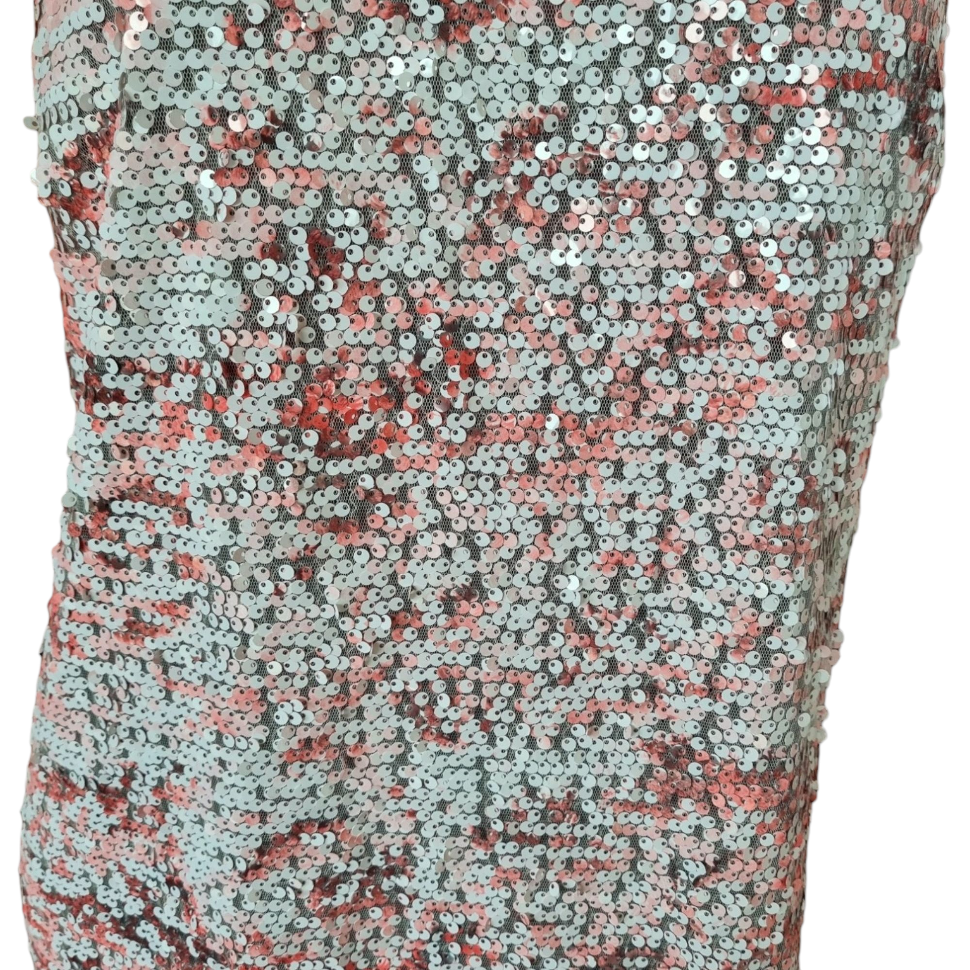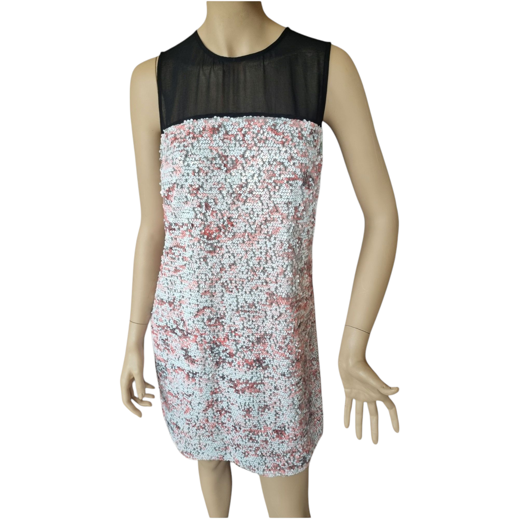 Vestido corto sin mangas con cuerpo en lentejuelas. Parte superior en punto de seda negro transparente, que ata en el cuello parte trasera con una lazada. Forro interior negro en punto de seda. Talla M / 38 / 10