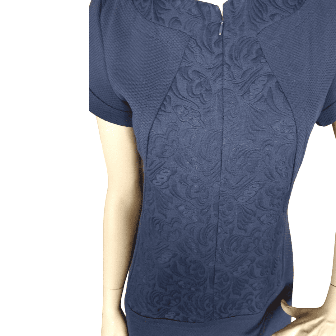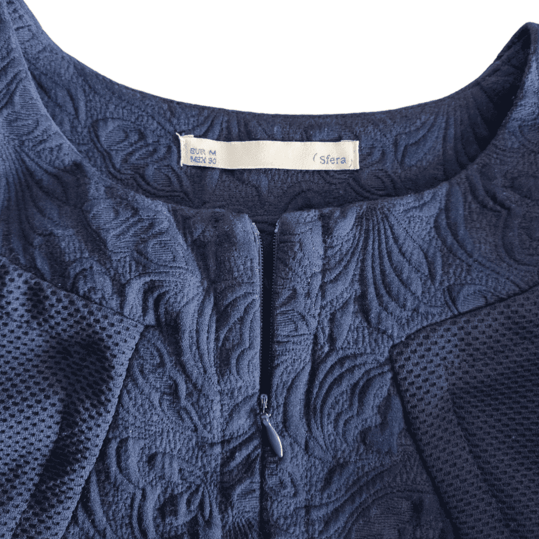 Vestido azul marino semi entallado con cuello redondo. Cierre delantero con cremallera. Tejido delantero con brocado en la misma tela.