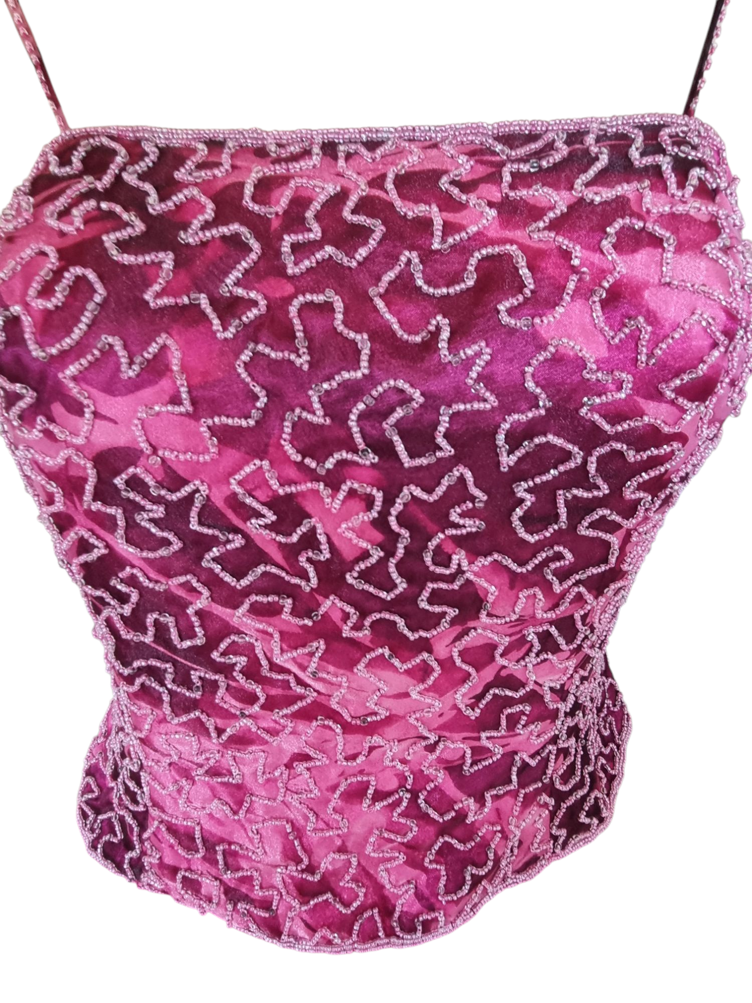 Vestido largo de fiesta en color fucsia. Cuerpo en color fucsia y morado, entallado con ligero relleno en el pecho, unido a la falda. Escote palabra de honor con tirantes. Estampado en pedrería. Falda al caer, con tres volantes. Cierre trasero con cremallera escondida. Forro interior. Chal a juego en tonos fucsia y morados. Talla XL / 42 / 14
