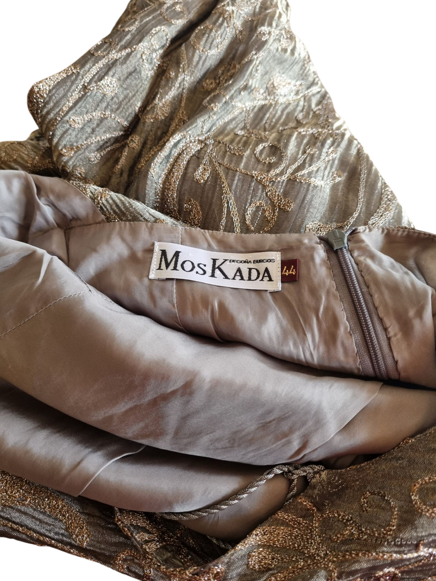 Vestido largo forrado en gris plata. Tejido bordado en hilo plateado. Escote en espalda con cordón plateado. Cierre de cremallera trasera escondida. Abertura trasera. Talla XXL / 44 / 16