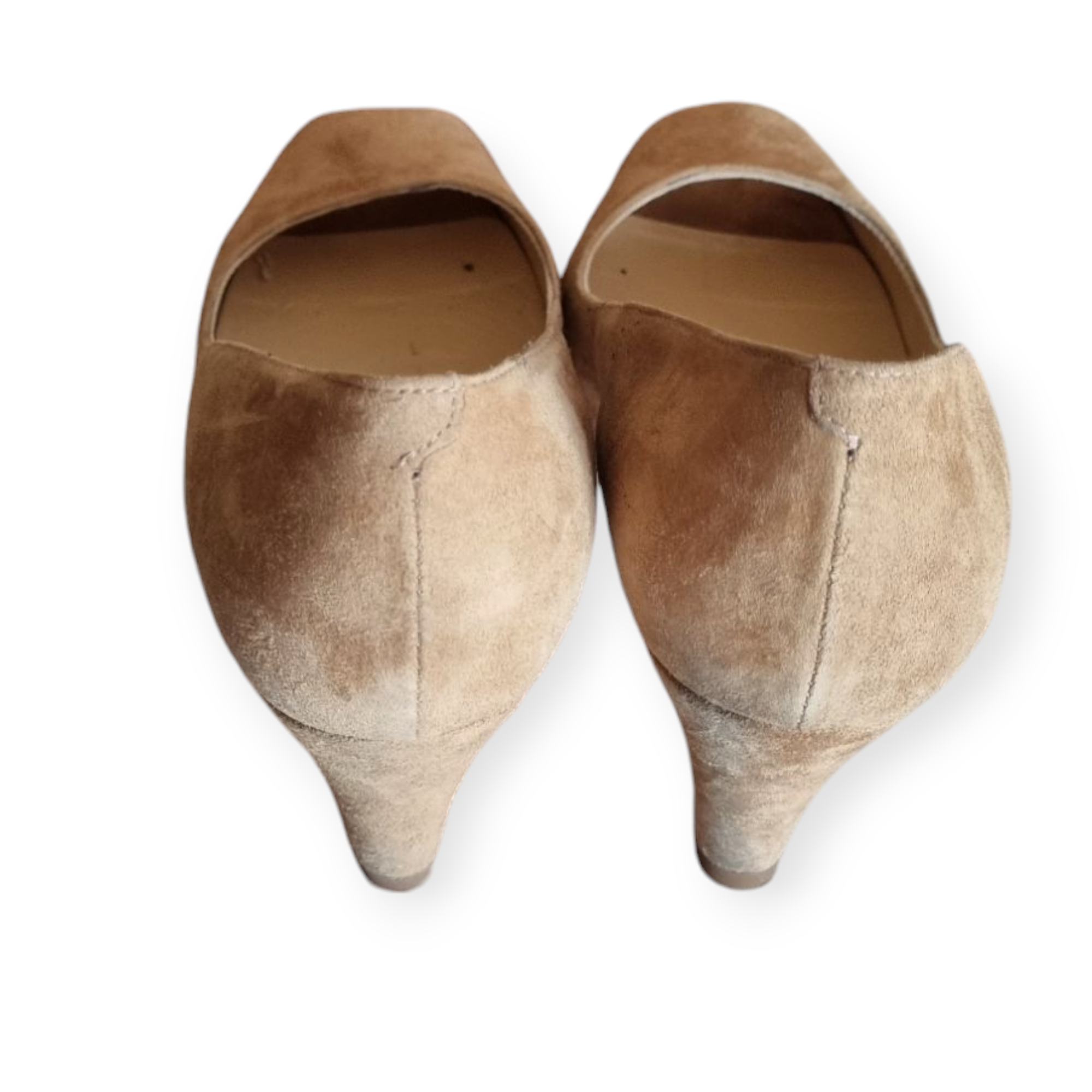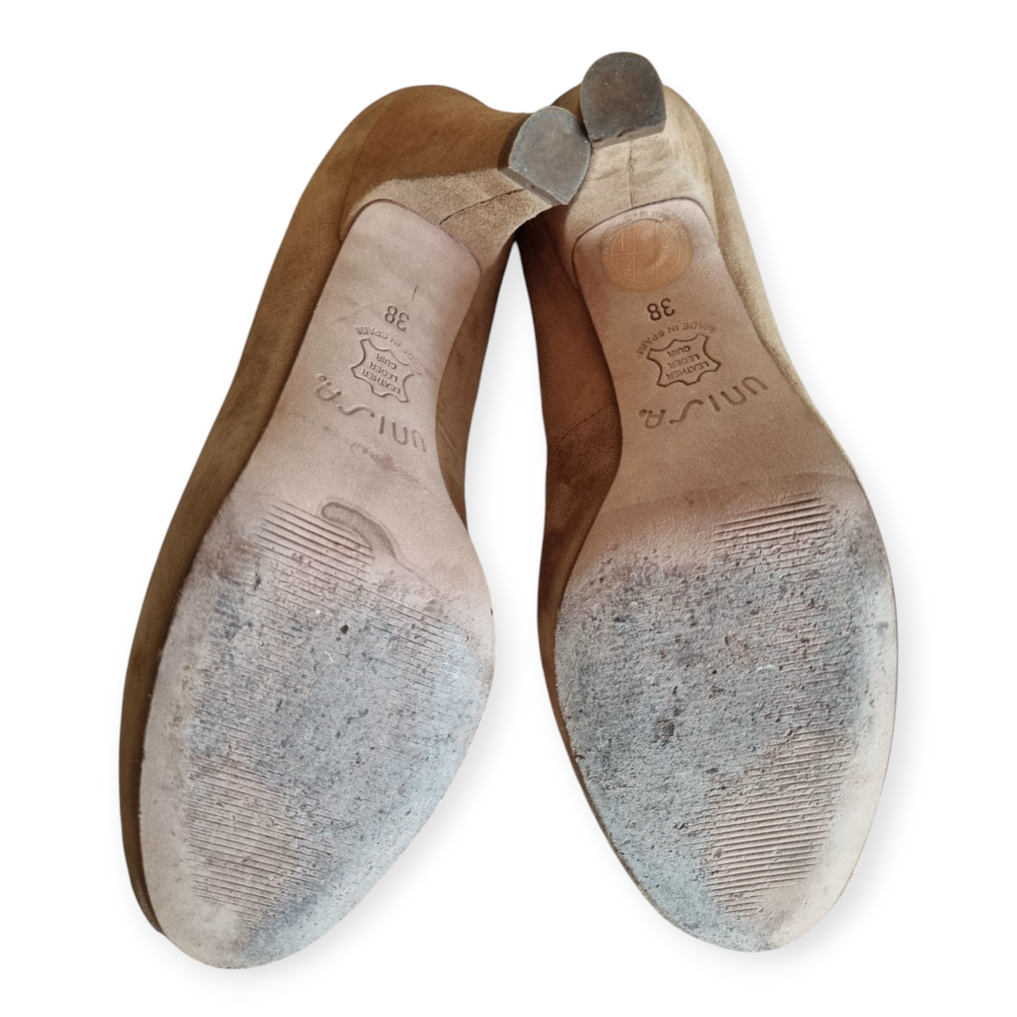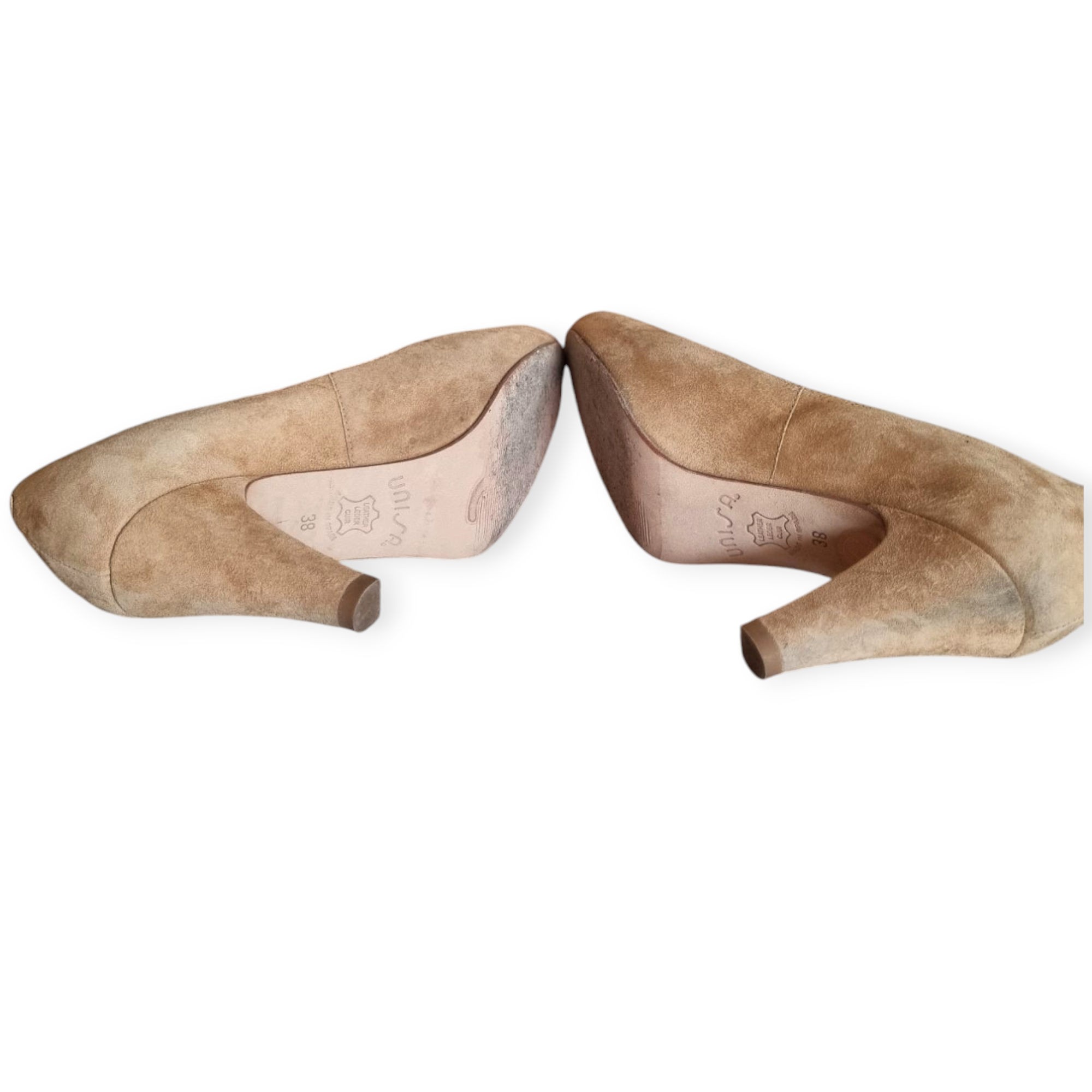 Zapatos de tacón de color beige. Pequeña abertura delantera. Ideal para ceremonias y eventos especiales. Poco usados. Talla 38. Conserva la caja original